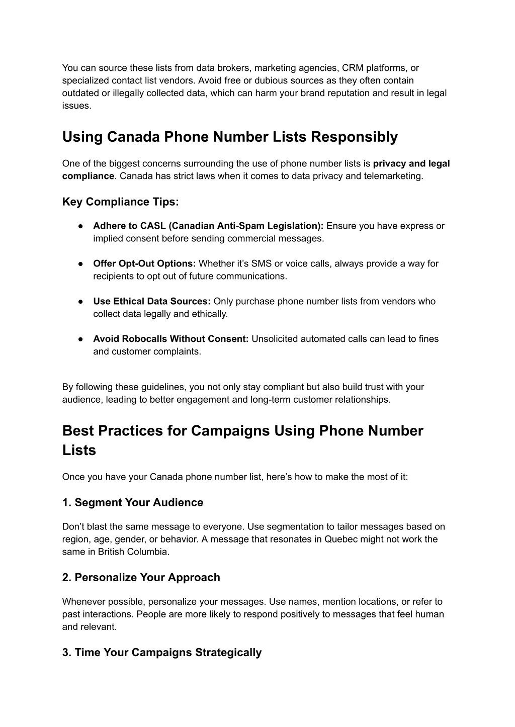 You can source these lists from data brokers, marketing agencies, CRM platforms, or specialized contact list vendors. Avoid free or dubious sources as they often contain outdated or illegally collected data, which can harm your brand reputation and result in legal issues. Using Canada Phone Number Lists Responsibly One of the biggest concerns surrounding the use of phone number lists is privacy and legal compliance. Canada has strict laws when it comes to data privacy and telemarketing. Key Compliance Tips: ● Adhere to CASL (Canadian Anti-Spam Legislation): Ensure you have express or implied consent before sending commercial messages. ● Offer Opt-Out Options: Whether it’s SMS or voice calls, always provide a way for recipients to opt out of future communications. ● Use Ethical Data Sources: Only purchase phone number lists from vendors who collect data legally and ethically. ● Avoid Robocalls Without Consent: Unsolicited automated calls can lead to fines and customer complaints. By following these guidelines, you not only stay compliant but also build trust with your audience, leading to better engagement and long-term customer relationships. Best Practices for Campaigns Using Phone Number Lists Once you have your Canada phone number list, here’s how to make the most of it: 1. Segment Your Audience Don’t blast the same message to everyone. Use segmentation to tailor messages based on region, age, gender, or behavior. A message that resonates in Quebec might not work the same in British Columbia. 2. Personalize Your Approach Whenever possible, personalize your messages. Use names, mention locations, or refer to past interactions. People are more likely to respond positively to messages that feel human and relevant. 3. Time Your Campaigns Strategically