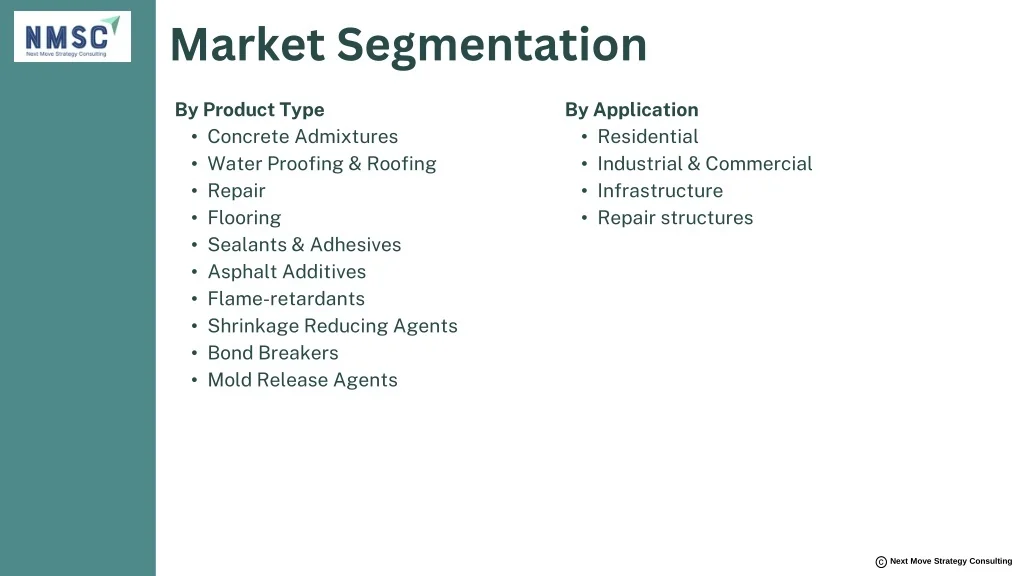 Market Segmentation By Product Type • Concrete Admixtures • Water Proofing & Roofing • Repair • Flooring • Sealants & Adhesives • Asphalt Additives • Flame-retardants • Shrinkage Reducing Agents • Bond Breakers • Mold Release Agents By Application • Residential • Industrial & Commercial • Infrastructure • Repair structures Next Move Strategy Consulting