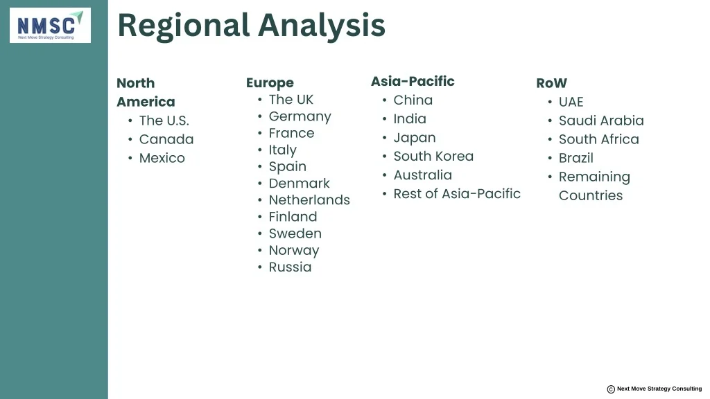 Regional Analysis Asia-Pacific • China • India • Japan • South Korea • Australia • Rest of Asia-Pacific Europe • The UK • Germany • France • Italy • Spain • Denmark • Netherlands • Finland • Sweden • Norway • Russia North America • The U.S. • Canada • Mexico RoW • UAE • Saudi Arabia • South Africa • Brazil • Remaining Countries Next Move Strategy Consulting