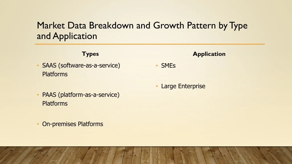 Market Data Breakdown and Growth Pattern by Type and Application Types • SAAS (software-as-a-service) Platforms • PAAS (platform-as-a-service) Platforms • On-premises Platforms Application • SMEs • Large Enterprise