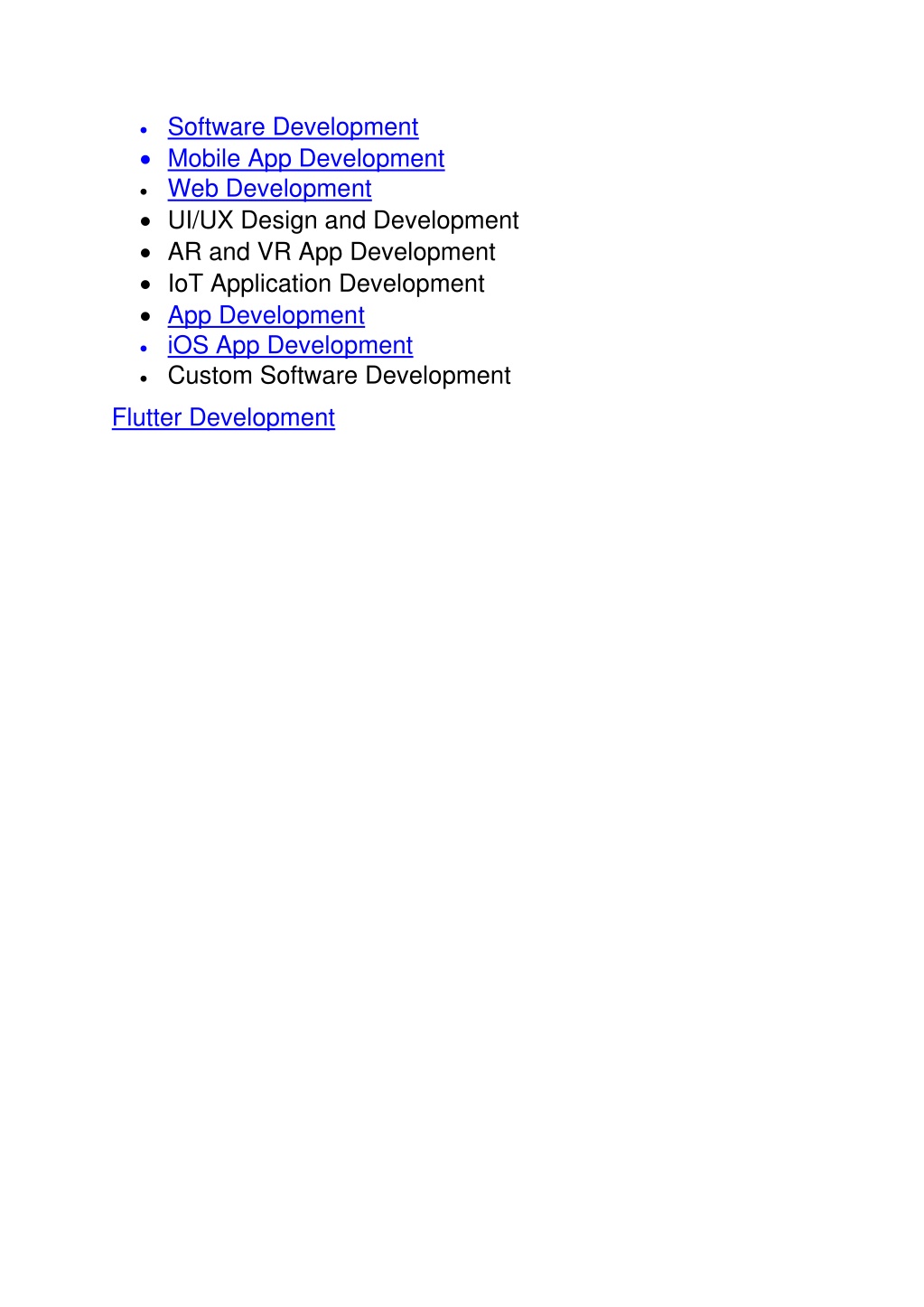 •Software Development • Mobile App Development •Web Development • UI/UX Design and Development • AR and VR App Development • IoT Application Development • App Development •iOS App Development •Custom Software Development Flutter Development