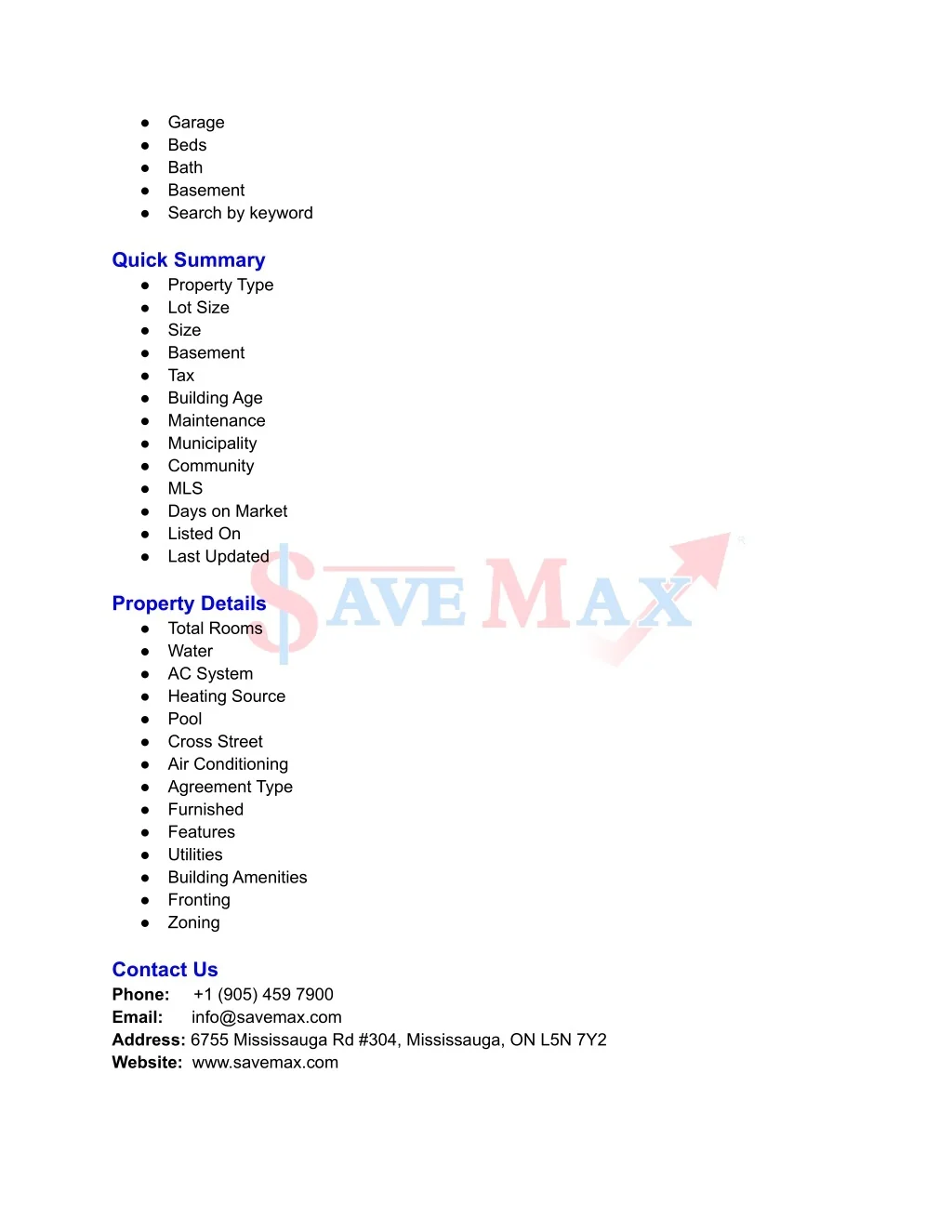 ● ● ● ● ● Garage Beds Bath Basement Search by keyword Quick Summary ● Property Type ● Lot Size ● Size ● Basement ● Tax ● Building Age ● Maintenance ● Municipality ● Community ● MLS ● Days on Market ● Listed On ● Last Updated Property Details ● Total Rooms ● Water ● AC System ● Heating Source ● Pool ● Cross Street ● Air Conditioning ● Agreement Type ● Furnished ● Features ● Utilities ● Building Amenities ● Fronting ● Zoning Contact Us Phone: Email: Address: 6755 Mississauga Rd #304, Mississauga, ON L5N 7Y2 Website: www.savemax.com +1 (905) 459 7900 info@savemax.com