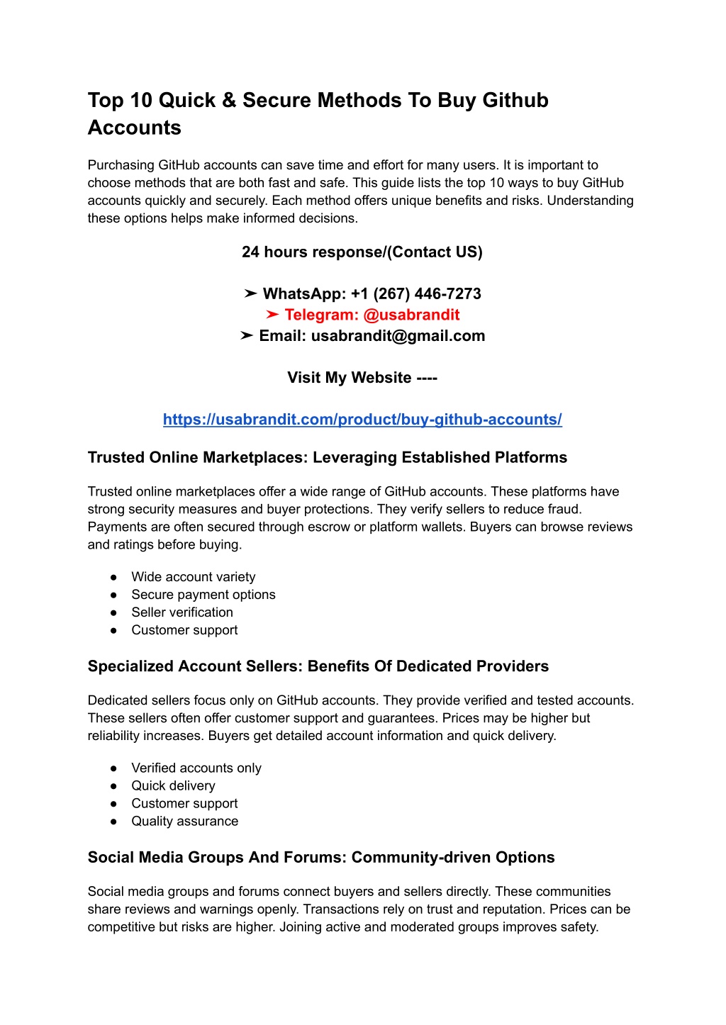 Top 10 Quick & Secure Methods To Buy Github Accounts Purchasing GitHub accounts can save time and effort for many users. It is important to choose methods that are both fast and safe. This guide lists the top 10 ways to buy GitHub accounts quickly and securely. Each method offers unique benefits and risks. Understanding these options helps make informed decisions. 24 hours response/(Contact US) ➤ WhatsApp: +1 (267) 446-7273 ➤ Telegram: @usabrandit ➤ Email: usabrandit@gmail.com Visit My Website ---- https://usabrandit.com/product/buy-github-accounts/ Trusted Online Marketplaces: Leveraging Established Platforms Trusted online marketplaces offer a wide range of GitHub accounts. These platforms have strong security measures and buyer protections. They verify sellers to reduce fraud. Payments are often secured through escrow or platform wallets. Buyers can browse reviews and ratings before buying. ● Wide account variety ● Secure payment options ● Seller verification ● Customer support Specialized Account Sellers: Benefits Of Dedicated Providers Dedicated sellers focus only on GitHub accounts. They provide verified and tested accounts. These sellers often offer customer support and guarantees. Prices may be higher but reliability increases. Buyers get detailed account information and quick delivery. ● Verified accounts only ● Quick delivery ● Customer support ● Quality assurance Social Media Groups And Forums: Community-driven Options Social media groups and forums connect buyers and sellers directly. These communities share reviews and warnings openly. Transactions rely on trust and reputation. Prices can be competitive but risks are higher. Joining active and moderated groups improves safety.
