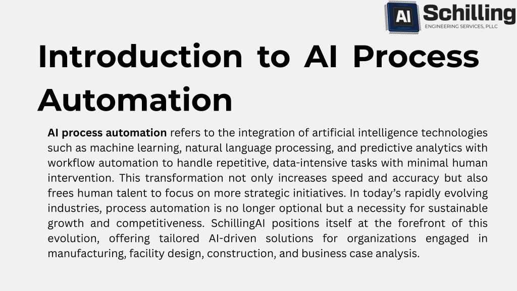 Introduction to AI Process Automation AI process automation refers to the integration of artificial intelligence technologies such as machine learning, natural language processing, and predictive analytics with workflow automation to handle repetitive, data-intensive tasks with minimal human intervention. This transformation not only increases speed and accuracy but also frees human talent to focus on more strategic initiatives. In today’s rapidly evolving industries, process automation is no longer optional but a necessity for sustainable growth and competitiveness. SchillingAI positions itself at the forefront of this evolution, offering tailored AI-driven solutions for organizations engaged in manufacturing, facility design, construction, and business case analysis.