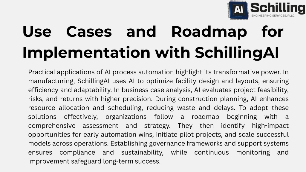Use Cases and Roadmap for Implementation with SchillingAI Practical applications of AI process automation highlight its transformative power. In manufacturing, SchillingAI uses AI to optimize facility design and layouts, ensuring efficiency and adaptability. In business case analysis, AI evaluates project feasibility, risks, and returns with higher precision. During construction planning, AI enhances resource allocation and scheduling, reducing waste and delays. To adopt these solutions effectively, organizations follow comprehensive assessment and strategy. They then identify high-impact opportunities for early automation wins, initiate pilot projects, and scale successful models across operations. Establishing governance frameworks and support systems ensures compliance and sustainability, while continuous monitoring and improvement safeguard long-term success. a roadmap beginning with a