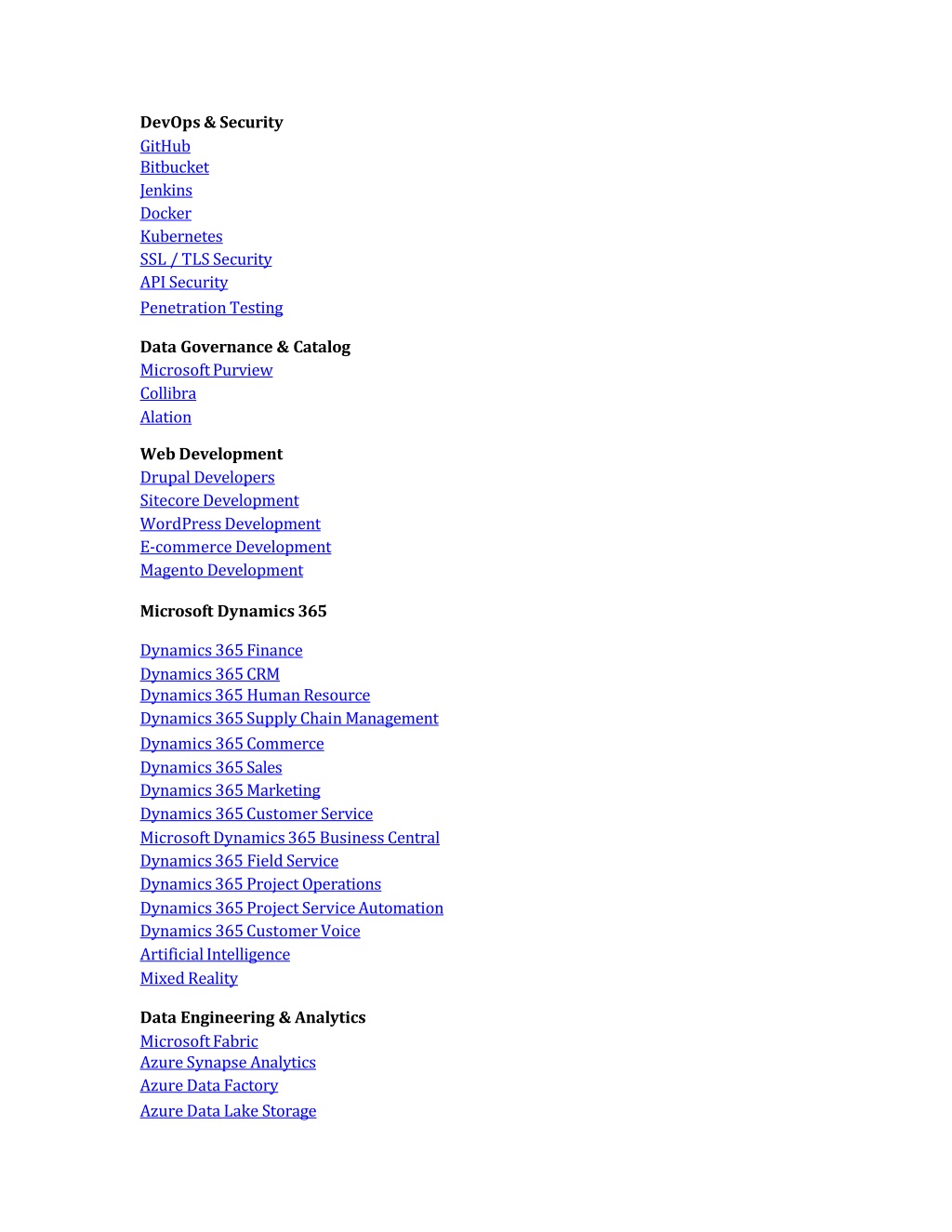 DevOps&Security GitHub BitbucketJenkinsDockerKubernetes SSL/TLSSecurityAPISecurity PenetrationTesting DataGovernance&Catalog MicrosoftPurviewCollibra Alation WebDevelopmentDrupalDevelopersSitecoreDevelopmentWordPressDevelopmentE-commerceDevelopmentMagentoDevelopment MicrosoftDynamics365 Dynamics365Finance Dynamics365CRM Dynamics365Human ResourceDynamics365SupplyChainManagement Dynamics365Commerce Dynamics365Sales Dynamics365MarketingDynamics365CustomerService MicrosoftDynamics365BusinessCentral Dynamics365FieldServiceDynamics365ProjectOperations Dynamics365ProjectServiceAutomation Dynamics365CustomerVoiceArtificialIntelligence MixedReality DataEngineering&Analytics MicrosoftFabric AzureSynapseAnalyticsAzureDataFactory AzureDataLakeStorage