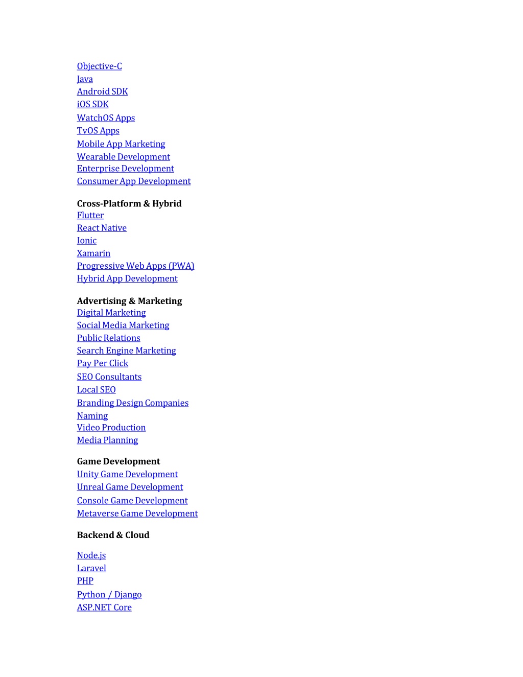 Objective-CJavaAndroidSDKiOSSDK WatchOS AppsTvOSApps MobileAppMarketing WearableDevelopment EnterpriseDevelopmentConsumerAppDevelopment Cross-Platform&Hybrid FlutterReactNativeIonicXamarin ProgressiveWebApps (PWA)HybridAppDevelopment Advertising&Marketing DigitalMarketingSocialMediaMarketingPublicRelations SearchEngine MarketingPayPerClick SEOConsultantsLocalSEO BrandingDesignCompanies Naming VideoProductionMediaPlanning GameDevelopmentUnityGame DevelopmentUnrealGameDevelopment ConsoleGameDevelopmentMetaverseGameDevelopment Backend&Cloud Node.jsLaravelPHP Python/ DjangoASP.NETCore