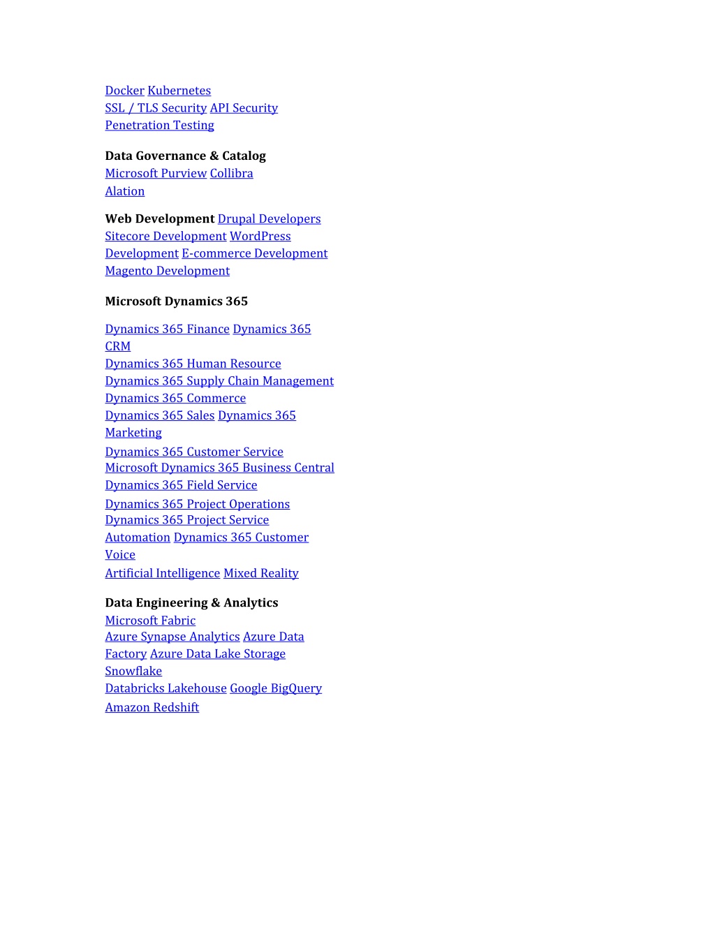 DockerKubernetes SSL/TLSSecurityAPISecurityPenetrationTesting DataGovernance&Catalog MicrosoftPurviewCollibra Alation WebDevelopmentDrupalDevelopersSitecoreDevelopmentWordPressDevelopmentE-commerceDevelopmentMagentoDevelopment MicrosoftDynamics365 Dynamics365FinanceDynamics365CRM Dynamics365HumanResourceDynamics365SupplyChainManagementDynamics365Commerce Dynamics365SalesDynamics365Marketing Dynamics365CustomerService MicrosoftDynamics365BusinessCentralDynamics365FieldService Dynamics365ProjectOperations Dynamics365ProjectServiceAutomationDynamics365CustomerVoice ArtificialIntelligenceMixedReality DataEngineering&Analytics MicrosoftFabric AzureSynapseAnalyticsAzureDataFactoryAzureDataLakeStorageSnowflake DatabricksLakehouseGoogleBigQuery AmazonRedshift