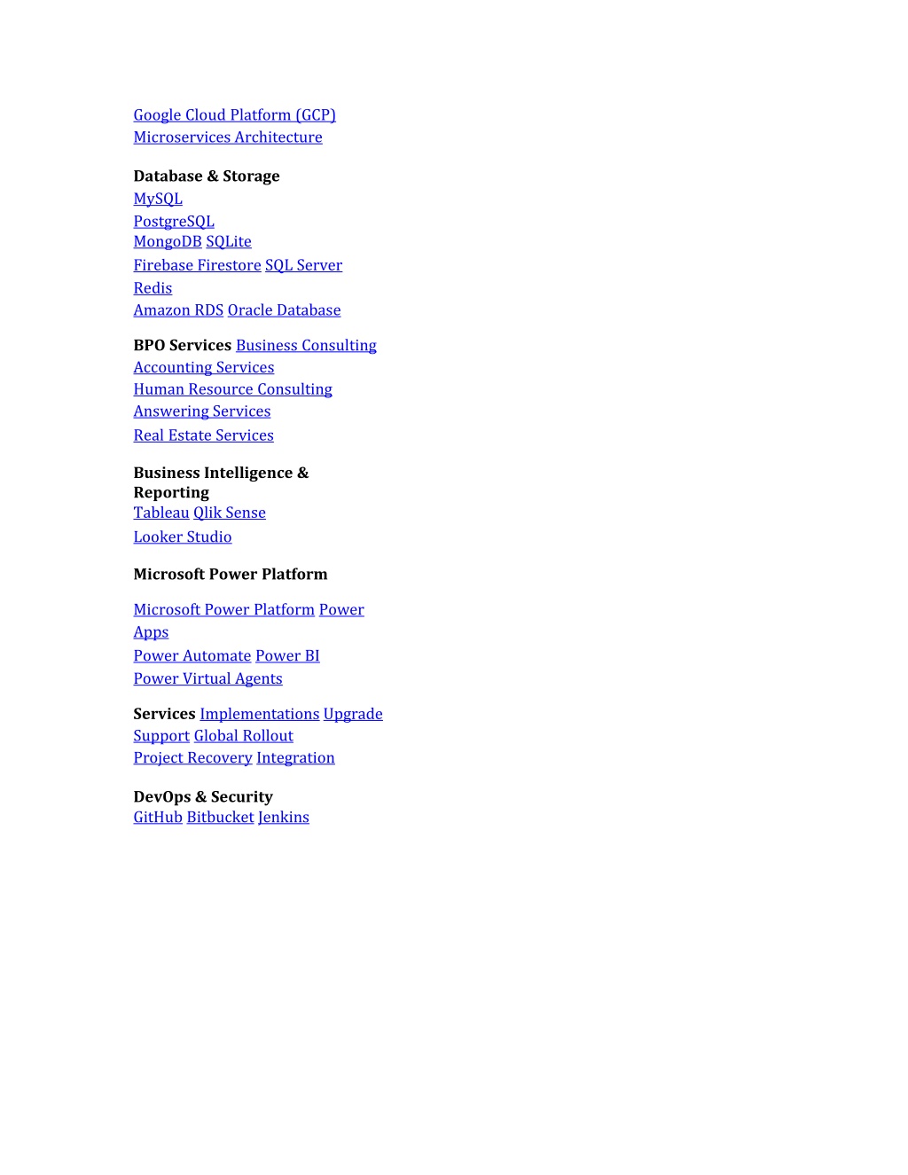 GoogleCloudPlatform(GCP)MicroservicesArchitecture Database&Storage MySQL PostgreSQL MongoDBSQLite FirebaseFirestoreSQLServer Redis AmazonRDSOracleDatabase BPOServicesBusinessConsultingAccountingServices HumanResourceConsultingAnsweringServices RealEstateServices BusinessIntelligence&Reporting TableauQlikSense LookerStudio MicrosoftPowerPlatform MicrosoftPowerPlatformPowerApps PowerAutomatePowerBI PowerVirtualAgents ServicesImplementationsUpgrade SupportGlobalRollout ProjectRecoveryIntegration DevOps&Security GitHubBitbucketJenkins