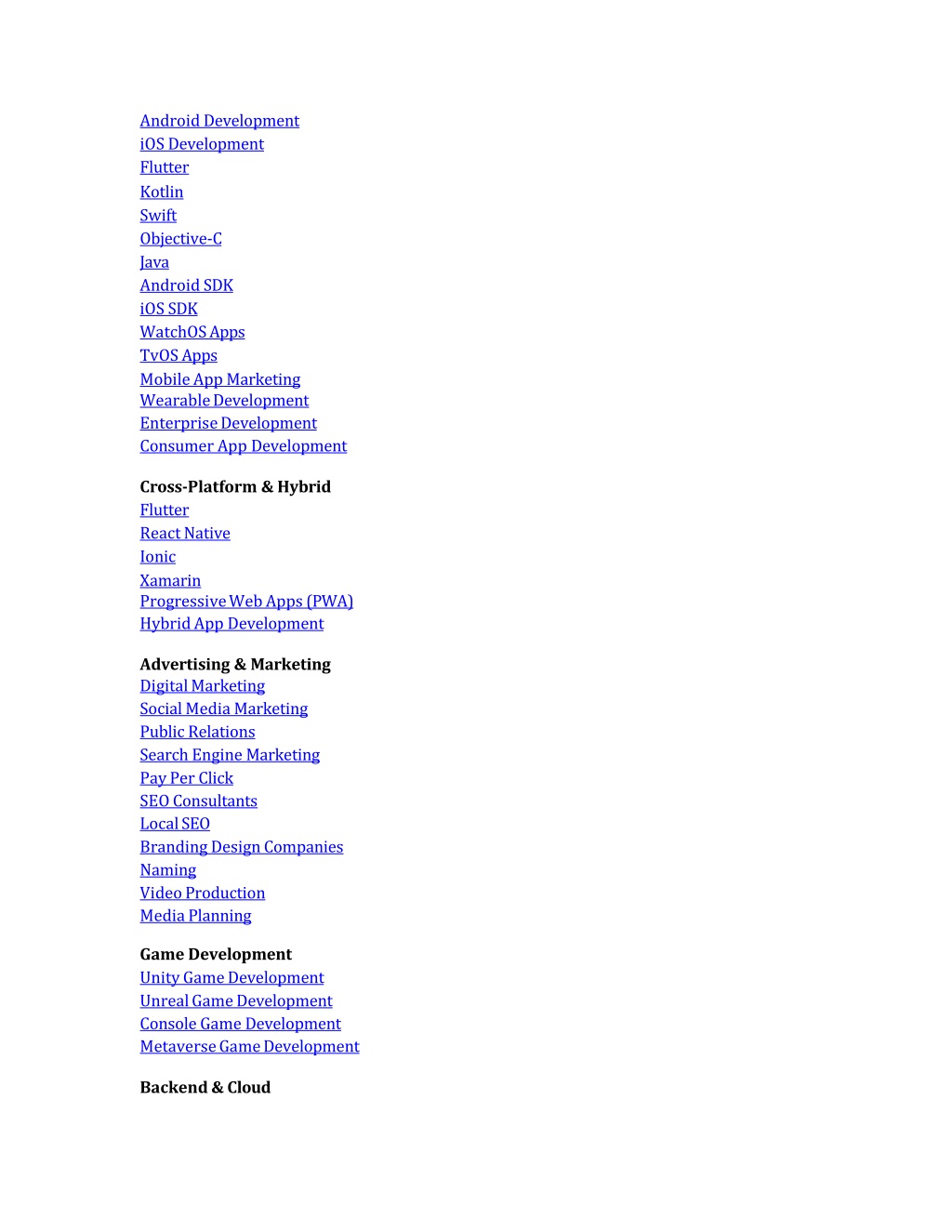 AndroidDevelopmentiOS DevelopmentFlutter KotlinSwiftObjective-CJava AndroidSDKiOS SDK WatchOSAppsTvOSApps MobileAppMarketing WearableDevelopmentEnterpriseDevelopmentConsumerAppDevelopment Cross-Platform&Hybrid FlutterReactNativeIonic Xamarin ProgressiveWebApps(PWA)HybridAppDevelopment Advertising&Marketing DigitalMarketingSocial Media MarketingPublicRelations SearchEngine MarketingPayPerClick SEOConsultantsLocalSEO BrandingDesignCompaniesNaming VideoProductionMediaPlanning Game DevelopmentUnityGameDevelopmentUnrealGameDevelopment ConsoleGameDevelopmentMetaverseGameDevelopment Backend&Cloud