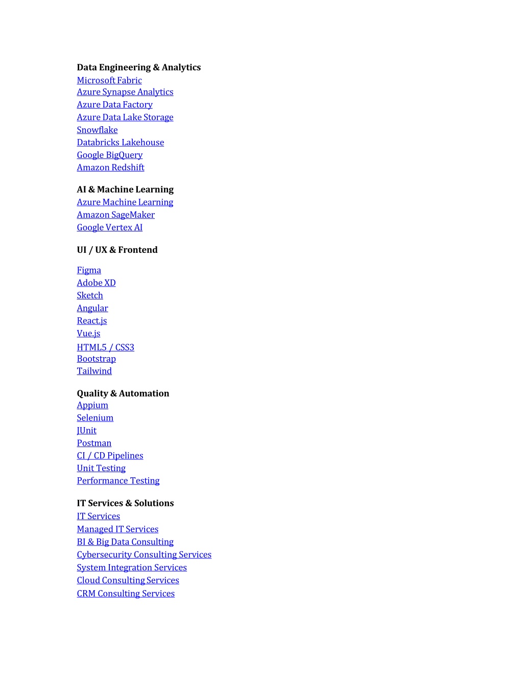 DataEngineering&Analytics MicrosoftFabric AzureSynapseAnalyticsAzureDataFactoryAzureDataLakeStorageSnowflake DatabricksLakehouseGoogle BigQueryAmazonRedshift AI&MachineLearning AzureMachineLearningAmazonSageMakerGoogleVertexAI UI/UX& Frontend FigmaAdobeXDSketchAngularReact.jsVue.js HTML5/CSS3 BootstrapTailwind Quality&Automation AppiumSeleniumJUnitPostman CI/CDPipelinesUnitTestingPerformanceTesting ITServices & Solutions ITServices ManagedITServices BI&BigDataConsultingCybersecurityConsultingServicesSystemIntegrationServicesCloudConsultingServices CRM ConsultingServices