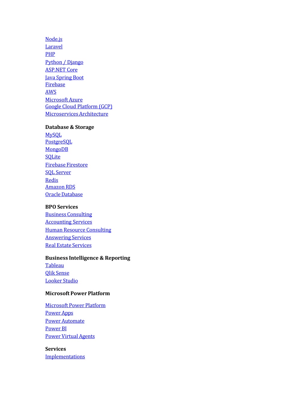 Node.jsLaravelPHP Python/ DjangoASP.NETCore JavaSpring Boot FirebaseAWS MicrosoftAzure GoogleCloud Platform (GCP)MicroservicesArchitecture Database&Storage MySQL PostgreSQLMongoDBSQLite FirebaseFirestoreSQLServer Redis AmazonRDSOracleDatabase BPOServices BusinessConsultingAccountingServices Human ResourceConsultingAnsweringServices RealEstateServices BusinessIntelligence&Reporting TableauQlikSense LookerStudio MicrosoftPowerPlatform MicrosoftPowerPlatformPowerApps PowerAutomatePowerBI PowerVirtualAgents Services Implementations