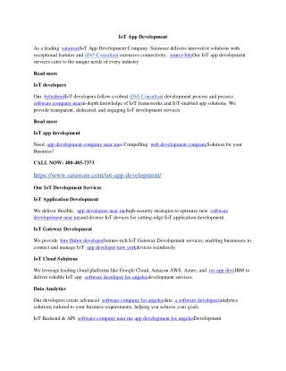 IoT App Development As a leading satawareIoT App Development Company, Sataware delivers innovative solutions with exceptional features and d365 Consultant extensive connectivity. source bitzOur IoT app development services cater to the unique needs of every industry. Read more IoT developers Our byteaheadIoT developers follow a robust d365 Consultant development process and possess software company nearin-depth knowledge of IoT frameworks and IoT-enabled app solutions. We provide transparent, dedicated, and engaging IoT development services. Read more IoT app development Need app development company near mea Compelling web development companySolution for your Business? CALL NOW: 480-485-7373 https://www.sataware.com/iot-app-development/ Our IoT Development Services IoT Application Development We deliver flexible, app developers near mehigh-security strategies to optimize new software developement near meand diverse IoT devices for cutting-edge IoT application development. IoT Gateway Development We provide hire flutter developerfeature-rich IoT Gateway Development services, enabling businesses to connect and manage IoT app developer new yorkdevices seamlessly. IoT Cloud Solutions We leverage leading cloud platforms like Google Cloud, Amazon AWS, Azure, and ios app devsIBM to deliver reliable IoT app software developer los angelesdevelopment services. Data Analytics Our developers create advanced software company los angelesdata a software developersanalytics solutions tailored to your business requirements, helping you achieve your goals. IoT Backend & API software company near me app development los angelesDevelopment