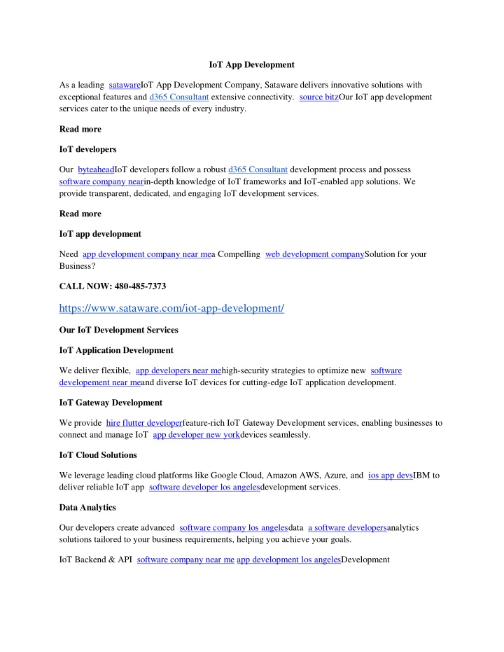 IoT App Development <br>As a leading satawareIoT App Development Company, Sataware delivers innovative solutions with exceptional features and d365 Consultant extensive connectivity. source bitzOur IoT app development services cater to the unique needs of every industry. <br>Read more <br>IoT developers <br>Our byteaheadIoT developers follow a robust d365 Consultant development process and possess software company nearin-depth knowledge of IoT frameworks and IoT-enabled app solutions. We provide transparent, dedicated, and engaging IoT development services.