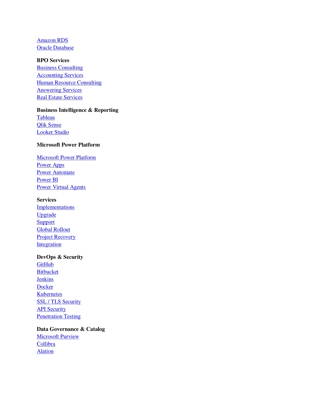 Amazon RDS Oracle Database BPO Services Business Consulting Accounting Services Human Resource Consulting Answering Services Real Estate Services Business Intelligence & Reporting Tableau Qlik Sense Looker Studio Microsoft Power Platform Microsoft Power Platform Power Apps Power Automate Power BI Power Virtual Agents Services Implementations Upgrade Support Global Rollout Project Recovery Integration DevOps & Security GitHub Bitbucket Jenkins Docker Kubernetes SSL / TLS Security API Security Penetration Testing Data Governance & Catalog Microsoft Purview Collibra Alation