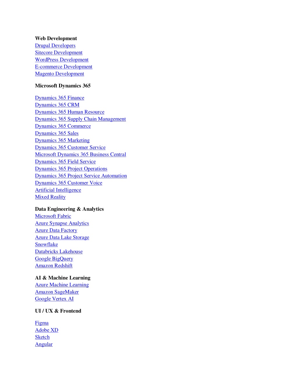 Web Development Drupal Developers Sitecore Development WordPress Development E-commerce Development Magento Development Microsoft Dynamics 365 Dynamics 365 Finance Dynamics 365 CRM Dynamics 365 Human Resource Dynamics 365 Supply Chain Management Dynamics 365 Commerce Dynamics 365 Sales Dynamics 365 Marketing Dynamics 365 Customer Service Microsoft Dynamics 365 Business Central Dynamics 365 Field Service Dynamics 365 Project Operations Dynamics 365 Project Service Automation Dynamics 365 Customer Voice Artificial Intelligence Mixed Reality Data Engineering & Analytics Microsoft Fabric Azure Synapse Analytics Azure Data Factory Azure Data Lake Storage Snowflake Databricks Lakehouse Google BigQuery Amazon Redshift AI & Machine Learning Azure Machine Learning Amazon SageMaker Google Vertex AI UI / UX & Frontend Figma Adobe XD Sketch Angular