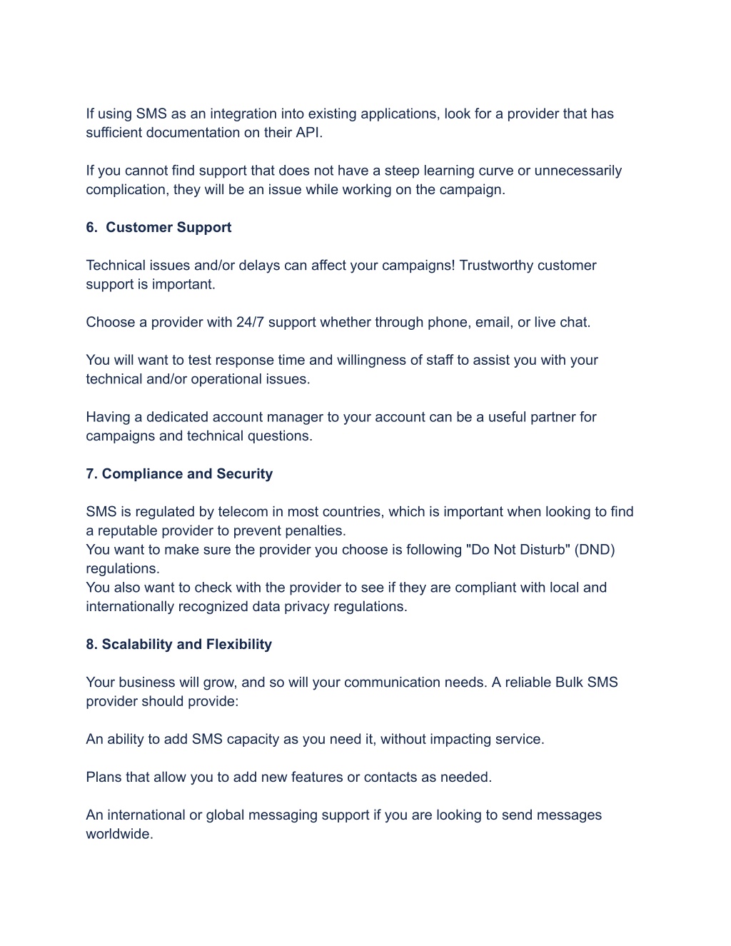If using SMS as an integration into existing applications, look for a provider that has sufficient documentation on their API. If you cannot find support that does not have a steep learning curve or unnecessarily complication, they will be an issue while working on the campaign. 6. Customer Support Technical issues and/or delays can affect your campaigns! Trustworthy customer support is important. Choose a provider with 24/7 support whether through phone, email, or live chat. You will want to test response time and willingness of staff to assist you with your technical and/or operational issues. Having a dedicated account manager to your account can be a useful partner for campaigns and technical questions. 7. Compliance and Security SMS is regulated by telecom in most countries, which is important when looking to find a reputable provider to prevent penalties. You want to make sure the provider you choose is following "Do Not Disturb" (DND) regulations. You also want to check with the provider to see if they are compliant with local and internationally recognized data privacy regulations. 8. Scalability and Flexibility Your business will grow, and so will your communication needs. A reliable Bulk SMS provider should provide: An ability to add SMS capacity as you need it, without impacting service. Plans that allow you to add new features or contacts as needed. An international or global messaging support if you are looking to send messages worldwide.