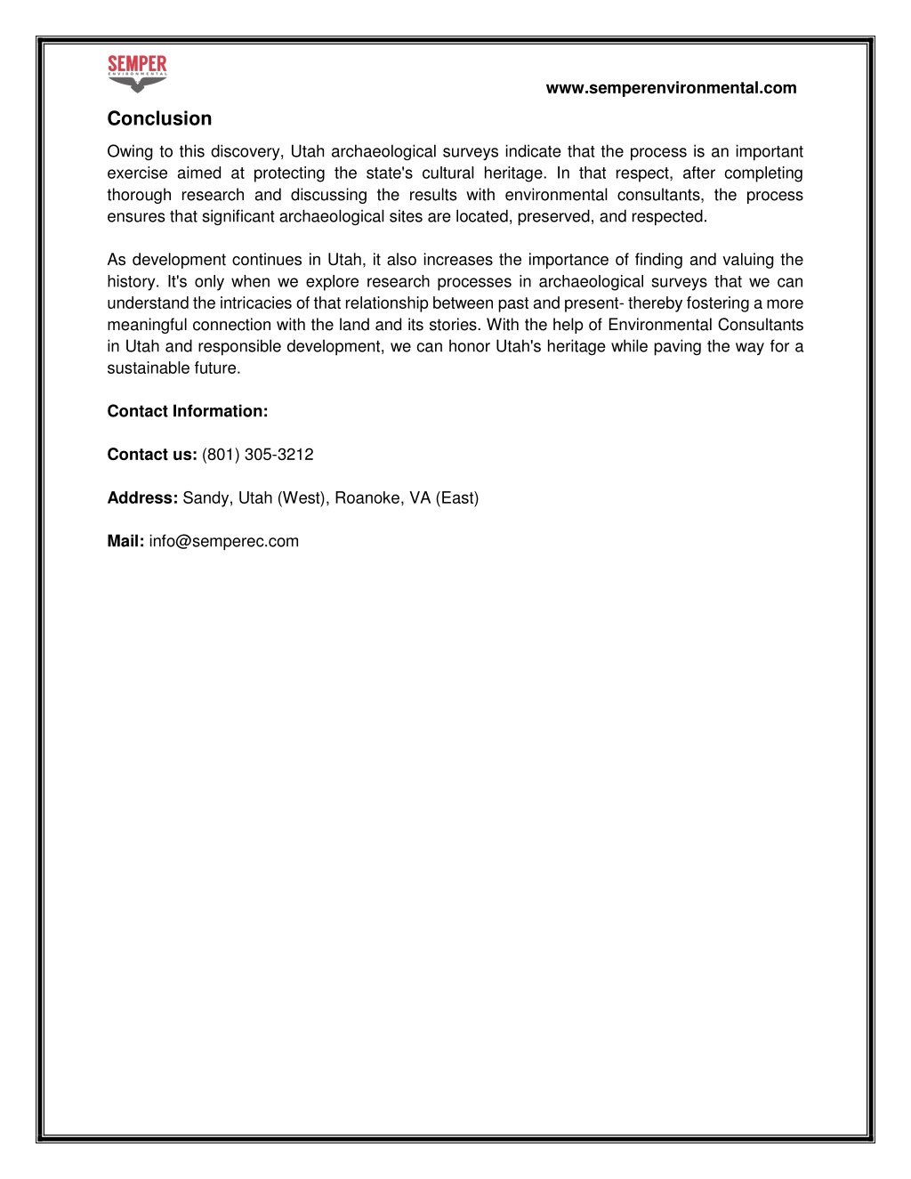 www.semperenvironmental.com Conclusion Owing to this discovery, Utah archaeological surveys indicate that the process is an important exercise aimed at protecting the state's cultural heritage. In that respect, after completing thorough research and discussing the results with environmental consultants, the process ensures that significant archaeological sites are located, preserved, and respected. As development continues in Utah, it also increases the importance of finding and valuing the history. It's only when we explore research processes in archaeological surveys that we can understand the intricacies of that relationship between past and present- thereby fostering a more meaningful connection with the land and its stories. With the help of Environmental Consultants in Utah and responsible development, we can honor Utah's heritage while paving the way for a sustainable future. Contact Information: Contact us: (801) 305-3212 Address: Sandy, Utah (West), Roanoke, VA (East) Mail: info@semperec.com
