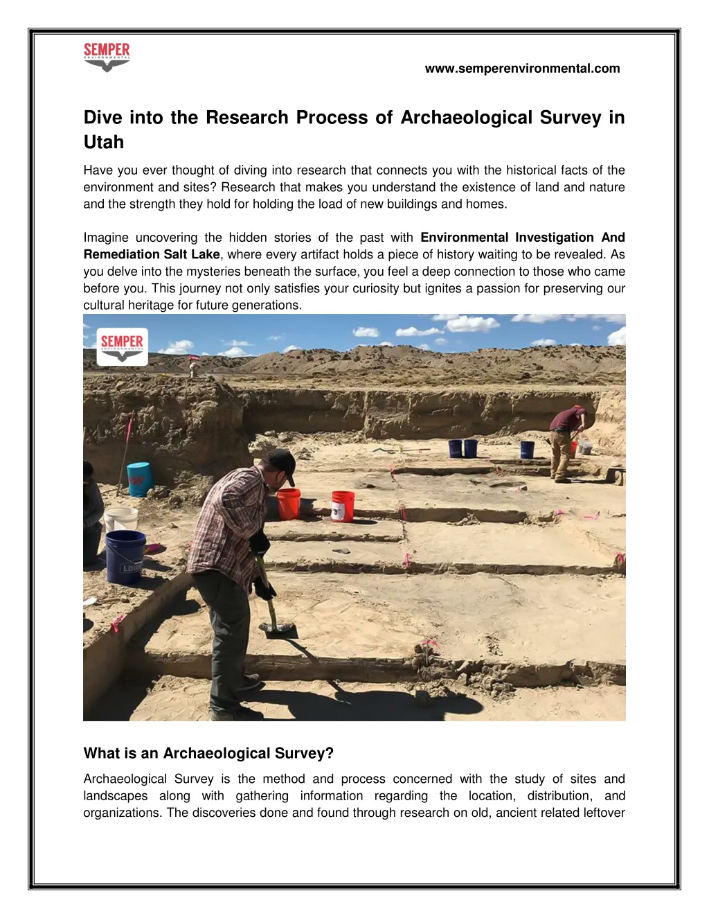 www.semperenvironmental.com Dive into the Research Process of Archaeological Survey in Utah Have you ever thought of diving into research that connects you with the historical facts of the environment and sites? Research that makes you understand the existence of land and nature and the strength they hold for holding the load of new buildings and homes. Imagine uncovering the hidden stories of the past with Environmental Investigation And Remediation Salt Lake, where every artifact holds a piece of history waiting to be revealed. As you delve into the mysteries beneath the surface, you feel a deep connection to those who came before you. This journey not only satisfies your curiosity but ignites a passion for preserving our cultural heritage for future generations. What is an Archaeological Survey? Archaeological Survey is the method and process concerned with the study of sites and landscapes along with gathering information regarding the location, distribution, and organizations. The discoveries done and found through research on old, ancient related leftover