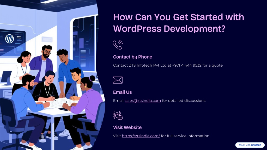 How Can You Get Started with WordPress Development? Contact by Phone Contact ZTS Infotech Pvt Ltd at +971 4 444 9532 for a quote Email Us Email sales@ztsindia.com for detailed discussions Visit Website Visit https://ztsindia.com/ for full service information