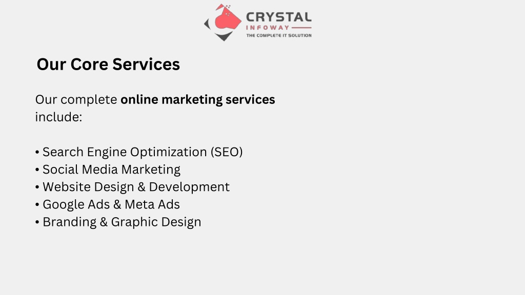 Our Core Services Our complete online marketing services include: • Search Engine Optimization (SEO) • Social Media Marketing • Website Design & Development • Google Ads & Meta Ads • Branding & Graphic Design