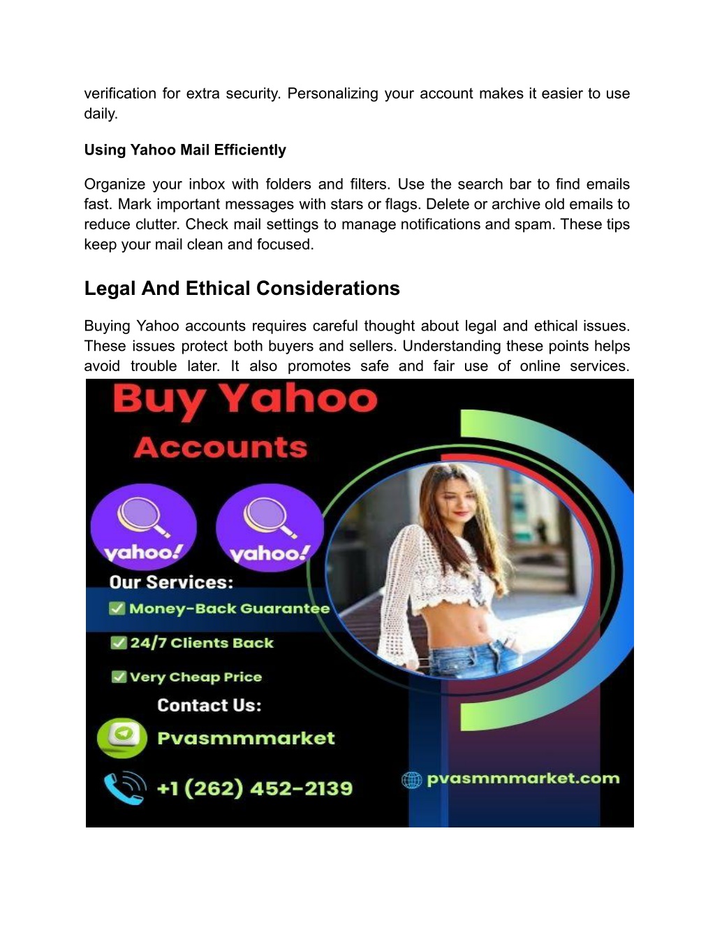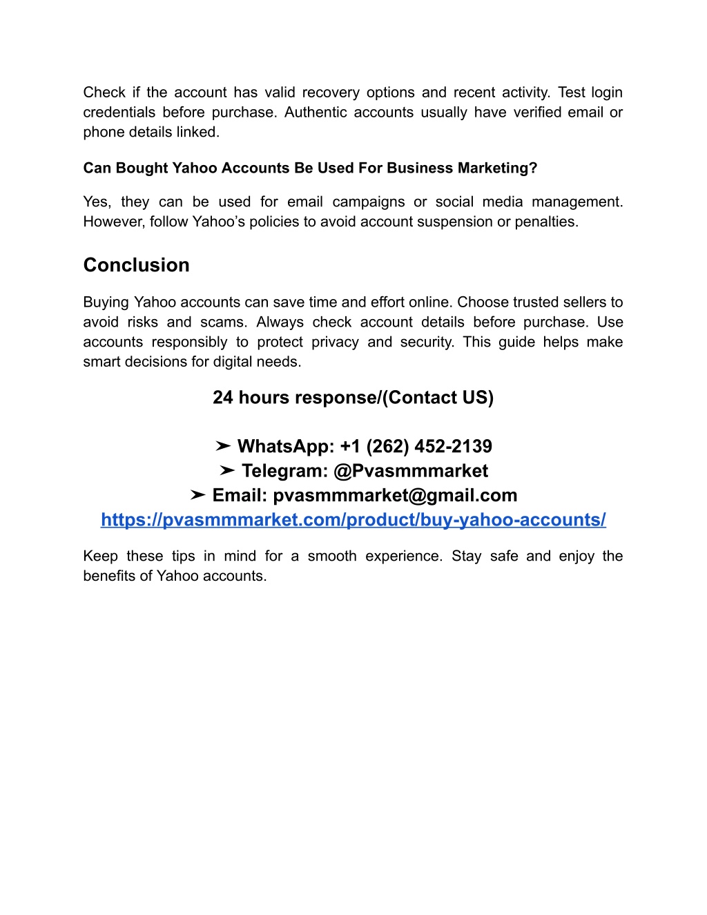 Check if the account has valid recovery options and recent activity. Test login credentials before purchase. Authentic accounts usually have verified email or phone details linked. Can Bought Yahoo Accounts Be Used For Business Marketing? Yes, they can be used for email campaigns or social media management. However, follow Yahoo’s policies to avoid account suspension or penalties. Conclusion Buying Yahoo accounts can save time and effort online. Choose trusted sellers to avoid risks and scams. Always check account details before purchase. Use accounts responsibly to protect privacy and security. This guide helps make smart decisions for digital needs. 24 hours response/(Contact US) ➤ WhatsApp: +1 (262) 452-2139 ➤ Telegram: @Pvasmmmarket ➤ Email: pvasmmmarket@gmail.com https://pvasmmmarket.com/product/buy-yahoo-accounts/ Keep these tips in mind for a smooth experience. Stay safe and enjoy the benefits of Yahoo accounts.