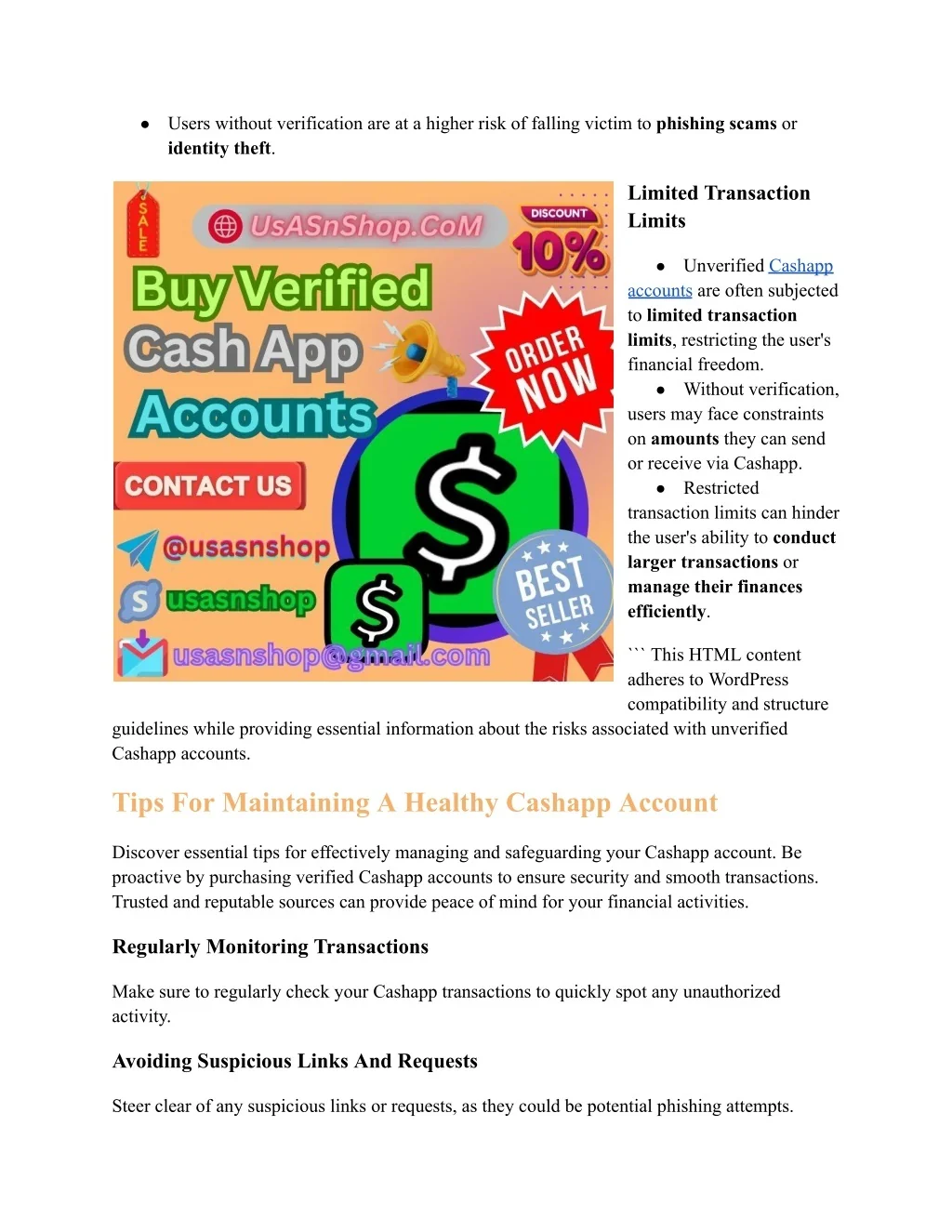 Users without verification are at a higher risk of falling victim to phishing scams or identity theft. ● Limited Transaction Limits Unverified Cashapp accounts are often subjected to limited transaction limits, restricting the user's financial freedom. ● Without verification, users may face constraints on amounts they can send or receive via Cashapp. ● Restricted transaction limits can hinder the user's ability to conduct larger transactions or manage their finances efficiently. ● ``` This HTML content adheres to WordPress compatibility and structure guidelines while providing essential information about the risks associated with unverified Cashapp accounts. Tips For Maintaining A Healthy Cashapp Account Discover essential tips for effectively managing and safeguarding your Cashapp account. Be proactive by purchasing verified Cashapp accounts to ensure security and smooth transactions. Trusted and reputable sources can provide peace of mind for your financial activities. Regularly Monitoring Transactions Make sure to regularly check your Cashapp transactions to quickly spot any unauthorized activity. Avoiding Suspicious Links And Requests Steer clear of any suspicious links or requests, as they could be potential phishing attempts.