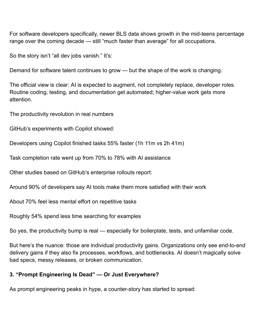 For software developers specifically, newer BLS data shows growth in the mid-teens percentage range over the coming decade — still “much faster than average” for all occupations. So the story isn’t “all dev jobs vanish.” It’s: Demand for software talent continues to grow — but the shape of the work is changing. The official view is clear: AI is expected to augment, not completely replace, developer roles. Routine coding, testing, and documentation get automated; higher-value work gets more attention. The productivity revolution in real numbers GitHub’s experiments with Copilot showed: Developers using Copilot finished tasks 55% faster (1h 11m vs 2h 41m) Task completion rate went up from 70% to 78% with AI assistance Other studies based on GitHub’s enterprise rollouts report: Around 90% of developers say AI tools make them more satisfied with their work About 70% feel less mental effort on repetitive tasks Roughly 54% spend less time searching for examples So yes, the productivity bump is real — especially for boilerplate, tests, and unfamiliar code. But here’s the nuance: those are individual productivity gains. Organizations only see end-to-end delivery gains if they also fix processes, workflows, and bottlenecks. AI doesn’t magically solve bad specs, messy releases, or broken communication. 3. “Prompt Engineering Is Dead” — Or Just Everywhere? As prompt engineering peaks in hype, a counter-story has started to spread: