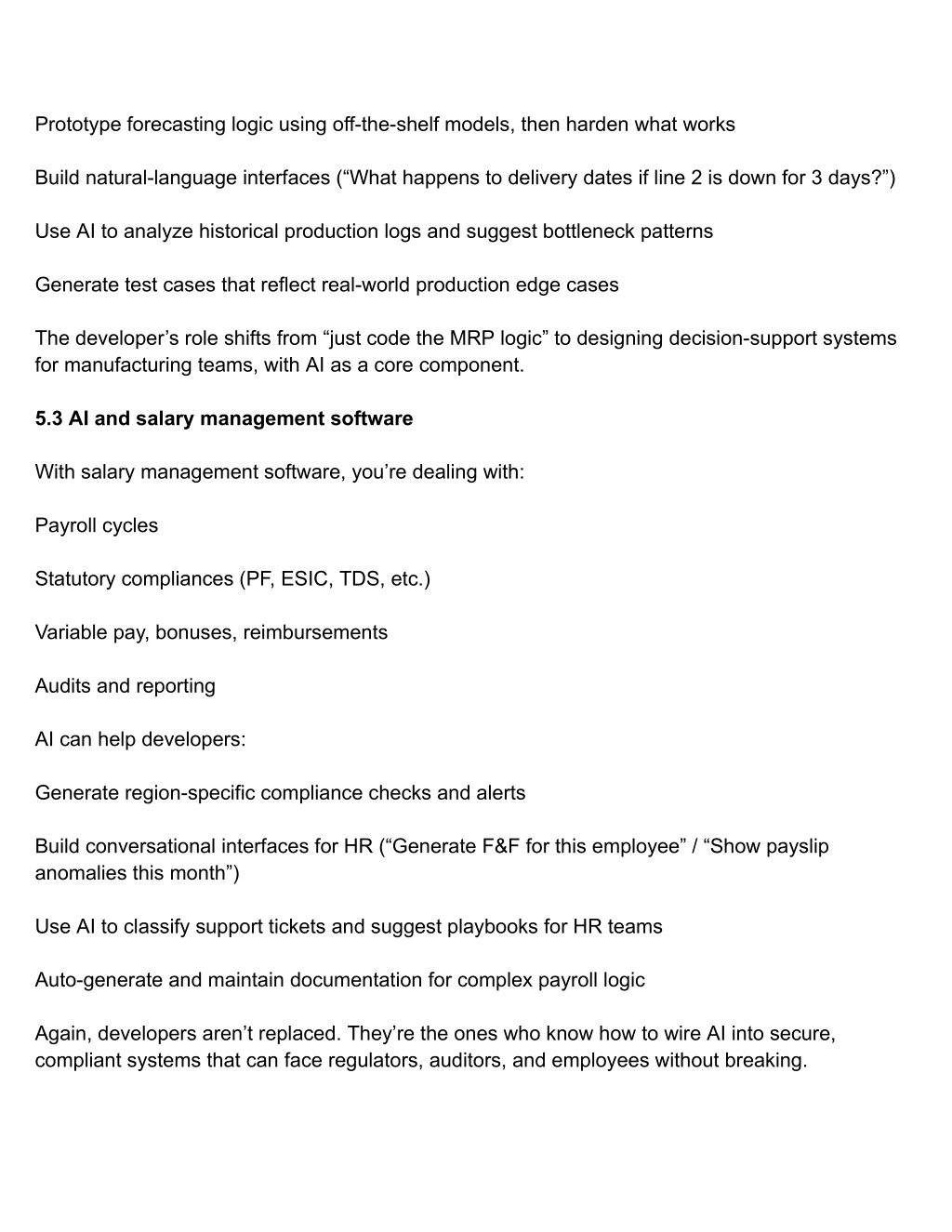 Prototype forecasting logic using off-the-shelf models, then harden what works Build natural-language interfaces (“What happens to delivery dates if line 2 is down for 3 days?”) Use AI to analyze historical production logs and suggest bottleneck patterns Generate test cases that reflect real-world production edge cases The developer’s role shifts from “just code the MRP logic” to designing decision-support systems for manufacturing teams, with AI as a core component. 5.3 AI and salary management software With salary management software, you’re dealing with: Payroll cycles Statutory compliances (PF, ESIC, TDS, etc.) Variable pay, bonuses, reimbursements Audits and reporting AI can help developers: Generate region-specific compliance checks and alerts Build conversational interfaces for HR (“Generate F&F for this employee” / “Show payslip anomalies this month”) Use AI to classify support tickets and suggest playbooks for HR teams Auto-generate and maintain documentation for complex payroll logic Again, developers aren’t replaced. They’re the ones who know how to wire AI into secure, compliant systems that can face regulators, auditors, and employees without breaking.