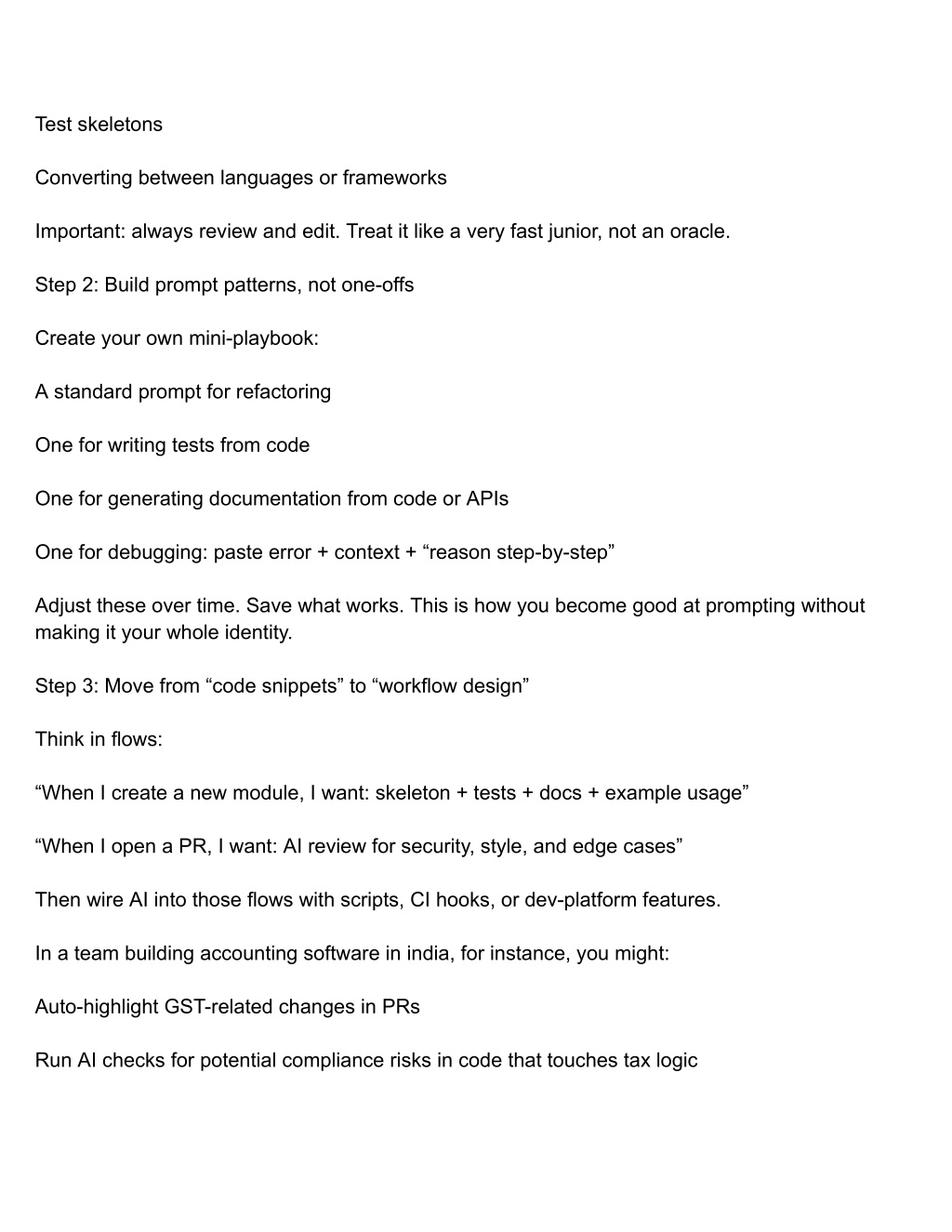 Test skeletons Converting between languages or frameworks Important: always review and edit. Treat it like a very fast junior, not an oracle. Step 2: Build prompt patterns, not one-offs Create your own mini-playbook: A standard prompt for refactoring One for writing tests from code One for generating documentation from code or APIs One for debugging: paste error + context + “reason step-by-step” Adjust these over time. Save what works. This is how you become good at prompting without making it your whole identity. Step 3: Move from “code snippets” to “workflow design” Think in flows: “When I create a new module, I want: skeleton + tests + docs + example usage” “When I open a PR, I want: AI review for security, style, and edge cases” Then wire AI into those flows with scripts, CI hooks, or dev-platform features. In a team building accounting software in india, for instance, you might: Auto-highlight GST-related changes in PRs Run AI checks for potential compliance risks in code that touches tax logic