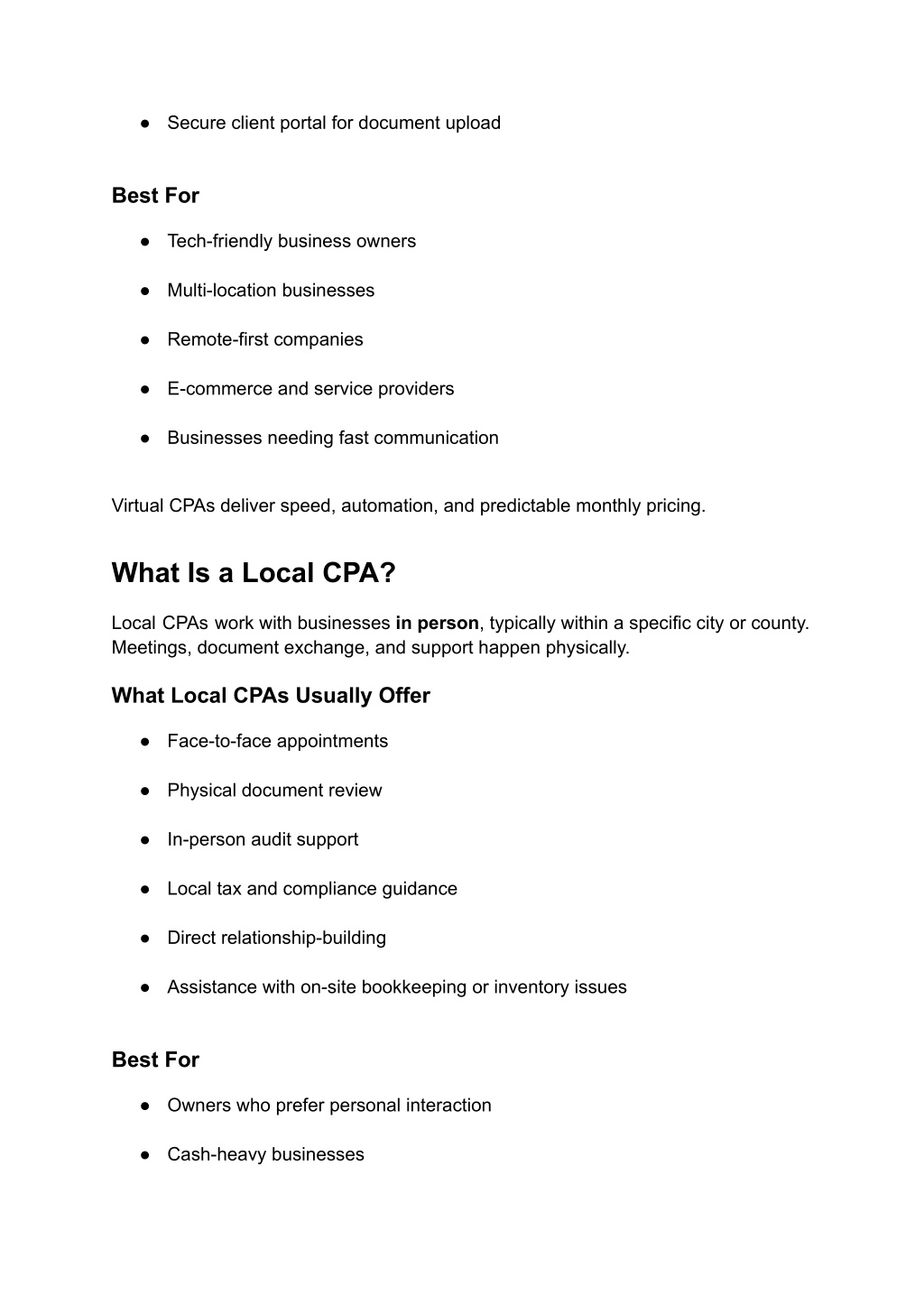 3. ● Secure client portal for document upload Best For ● Tech-friendly business owners ● Multi-location businesses ● Remote-first companies ● E-commerce and service providers ● Businesses needing fast communication Virtual CPAs deliver speed, automation, and predictable monthly pricing. What Is a Local CPA? Local CPAs work with businesses in person, typically within a specific city or county. Meetings, document exchange, and support happen physically. What Local CPAs Usually Offer ● Face-to-face appointments ● Physical document review ● In-person audit support ● Local tax and compliance guidance ● Direct relationship-building ● Assistance with on-site bookkeeping or inventory issues Best For ● Owners who prefer personal interaction ● Cash-heavy businesses