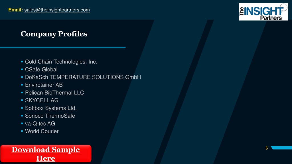 Email: sales@theinsightpartners.com Company Profiles Cold Chain Technologies, Inc. CSafe Global DoKaSch TEMPERATURE SOLUTIONS GmbH Envirotainer AB Pelican BioThermal LLC SKYCELL AG Softbox Systems Ltd. Sonoco ThermoSafe va-Q-tec AG World Courier Download Sample Here 6
