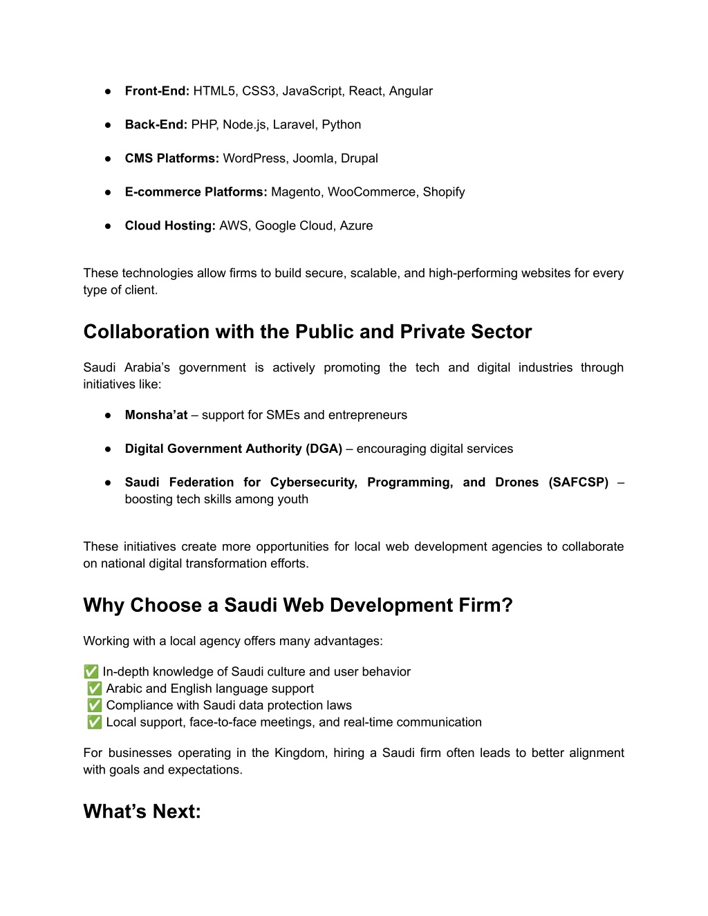 ● Front-End: HTML5, CSS3, JavaScript, React, Angular ● Back-End: PHP, Node.js, Laravel, Python ● CMS Platforms: WordPress, Joomla, Drupal ● E-commerce Platforms: Magento, WooCommerce, Shopify ● Cloud Hosting: AWS, Google Cloud, Azure These technologies allow firms to build secure, scalable, and high-performing websites for every type of client. Collaboration with the Public and Private Sector Saudi Arabia’s government is actively promoting the tech and digital industries through initiatives like: ● Monsha’at – support for SMEs and entrepreneurs ● Digital Government Authority (DGA) – encouraging digital services ● Saudi Federation for Cybersecurity, Programming, and Drones (SAFCSP) – boosting tech skills among youth These initiatives create more opportunities for local web development agencies to collaborate on national digital transformation efforts. Why Choose a Saudi Web Development Firm? Working with a local agency offers many advantages: ✅ In-depth knowledge of Saudi culture and user behavior ✅ Arabic and English language support ✅ Compliance with Saudi data protection laws ✅ Local support, face-to-face meetings, and real-time communication For businesses operating in the Kingdom, hiring a Saudi firm often leads to better alignment with goals and expectations. What’s Next: