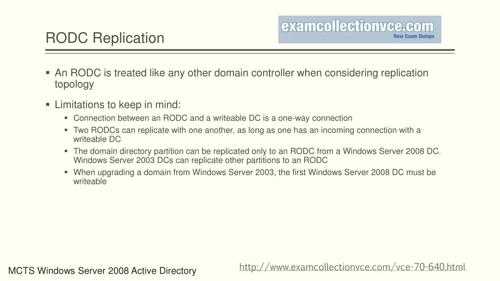 RODC Replication An RODC is treated like any other domain controller when considering replication topology Limitations to keep in mind: Connection between an RODC and a writeable DC is a one-way connection Two RODCs can replicate with one another, as long as one has an incoming connection with a writeable DC The domain directory partition can be replicated only to an RODC from a Windows Server 2008 DC. Windows Server 2003 DCs can replicate other partitions to an RODC When upgrading a domain from Windows Server 2003, the first Windows Server 2008 DC must be writeable http://www.examcollectionvce.com/vce-70-640.html MCTS Windows Server 2008 Active Directory