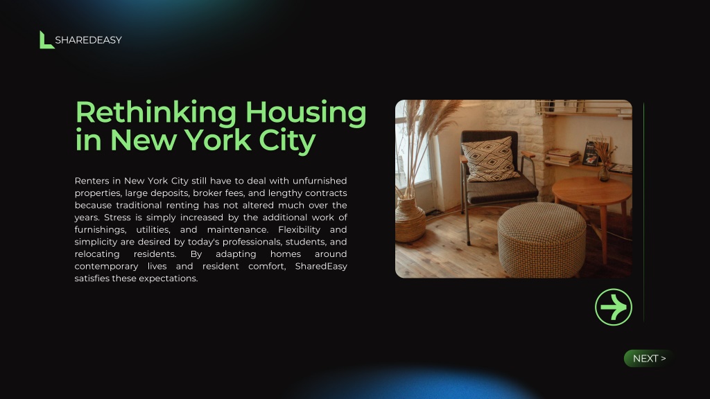 SHAREDEASY Rethinking Housing in New York City Renters in New York City still have to deal with unfurnished properties, large deposits, broker fees, and lengthy contracts because traditional renting has not altered much over the years. Stress is simply increased by the additional work of furnishings, utilities, and maintenance. Flexibility and simplicity are desired by today's professionals, students, and relocating residents. By contemporary lives and resident comfort, SharedEasy satisfies these expectations. adapting homes around NEXT >