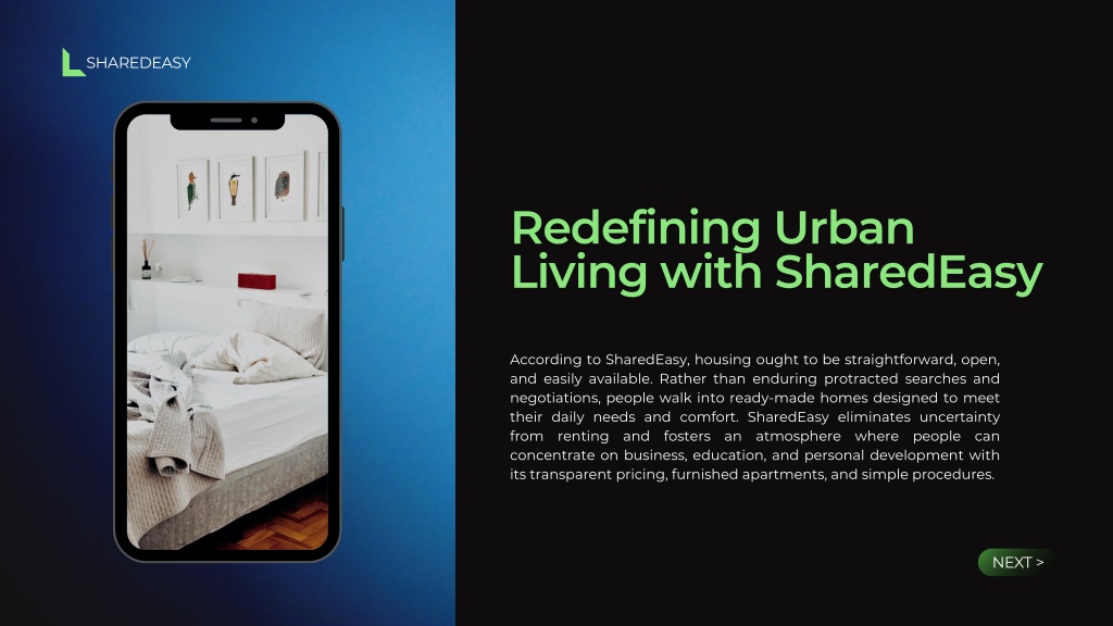 SHAREDEASY Redefining Urban Living with SharedEasy According to SharedEasy, housing ought to be straightforward, open, and easily available. Rather than enduring protracted searches and negotiations, people walk into ready-made homes designed to meet their daily needs and comfort. SharedEasy eliminates uncertainty from renting and fosters an atmosphere where people can concentrate on business, education, and personal development with its transparent pricing, furnished apartments, and simple procedures. NEXT >