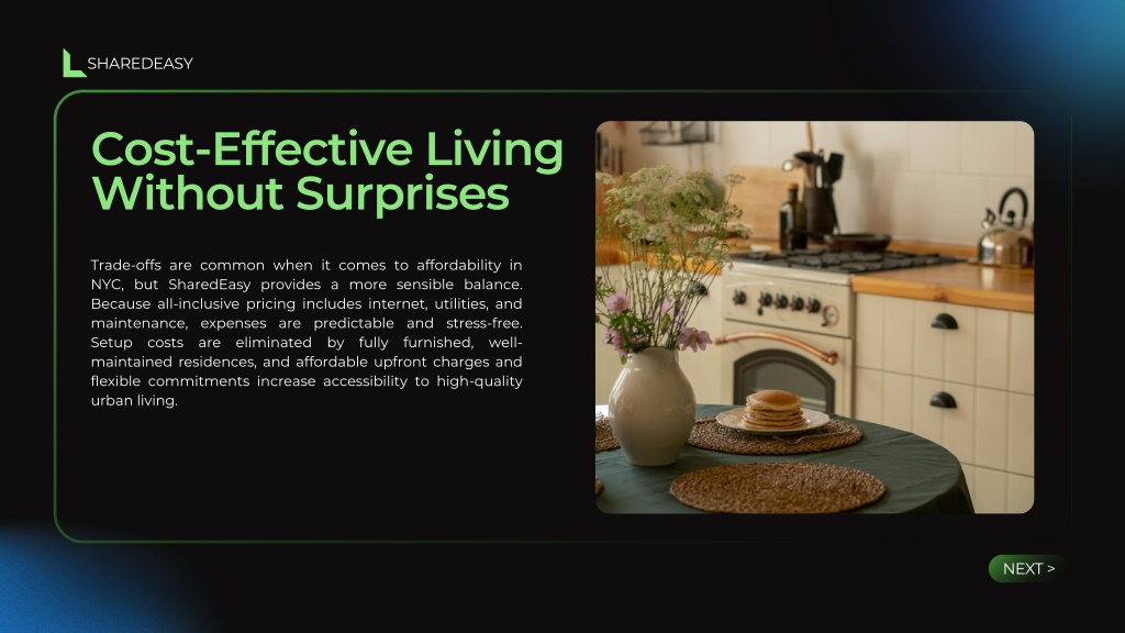 SHAREDEASY Cost-Effective Living Without Surprises Trade-offs are common when it comes to affordability in NYC, but SharedEasy provides a more sensible balance. Because all-inclusive pricing includes internet, utilities, and maintenance, expenses are predictable and stress-free. Setup costs are eliminated by fully furnished, well- maintained residences, and affordable upfront charges and flexible commitments increase accessibility to high-quality urban living. NEXT >