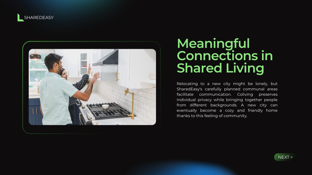 SHAREDEASY Meaningful Connections in Shared Living Relocating to a new city might be lonely, but SharedEasy's carefully planned communal areas facilitate communication. individual privacy while bringing together people from different backgrounds. A new city can eventually become a cozy and friendly home thanks to this feeling of community. Coliving preserves NEXT >