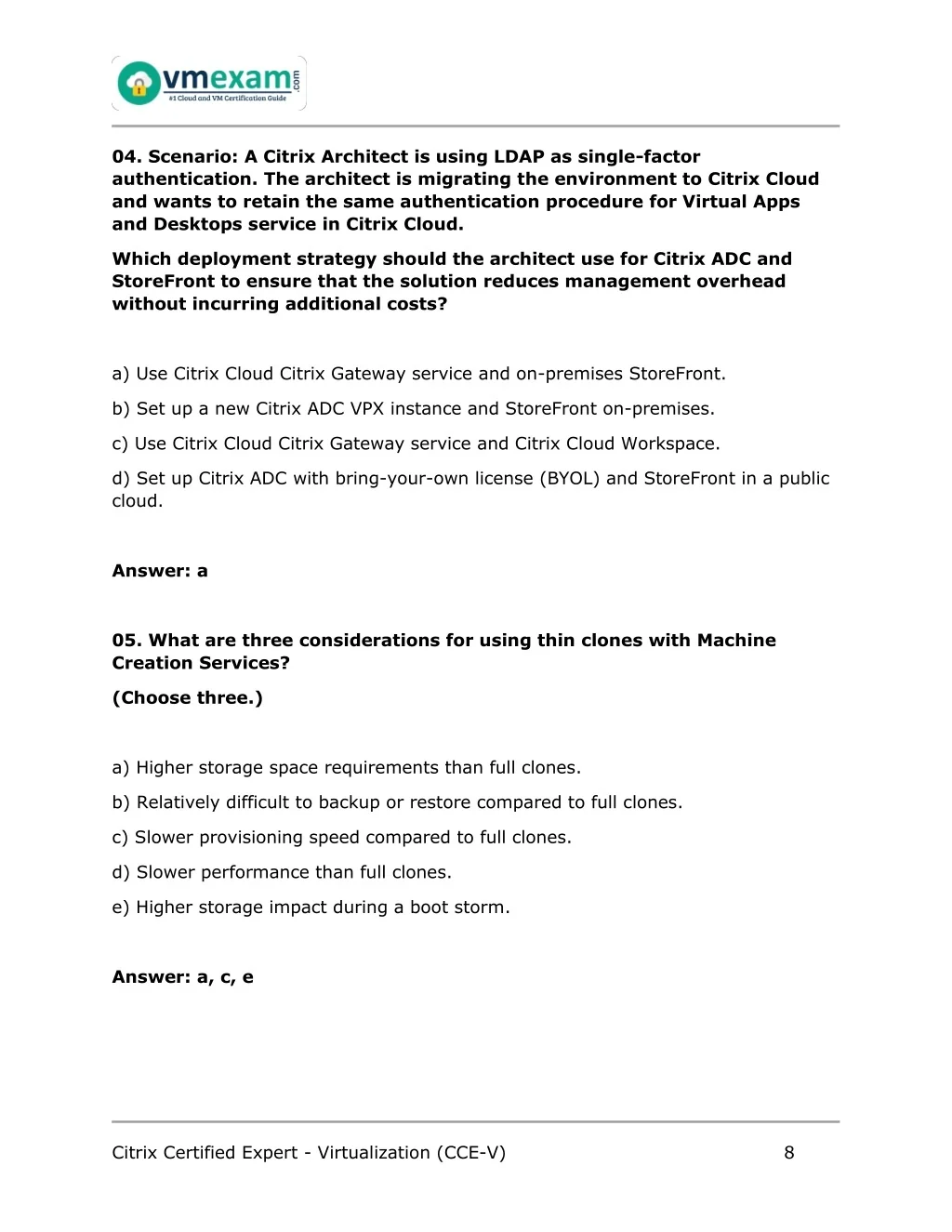 04. Scenario: A Citrix Architect is using LDAP as single-factor authentication. The architect is migrating the environment to Citrix Cloud and wants to retain the same authentication procedure for Virtual Apps and Desktops service in Citrix Cloud. Which deployment strategy should the architect use for Citrix ADC and StoreFront to ensure that the solution reduces management overhead without incurring additional costs? a) Use Citrix Cloud Citrix Gateway service and on-premises StoreFront. b) Set up a new Citrix ADC VPX instance and StoreFront on-premises. c) Use Citrix Cloud Citrix Gateway service and Citrix Cloud Workspace. d) Set up Citrix ADC with bring-your-own license (BYOL) and StoreFront in a public cloud. Answer: a 05. What are three considerations for using thin clones with Machine Creation Services? (Choose three.) a) Higher storage space requirements than full clones. b) Relatively difficult to backup or restore compared to full clones. c) Slower provisioning speed compared to full clones. d) Slower performance than full clones. e) Higher storage impact during a boot storm. Answer: a, c, e Citrix Certified Expert - Virtualization (CCE-V) 8