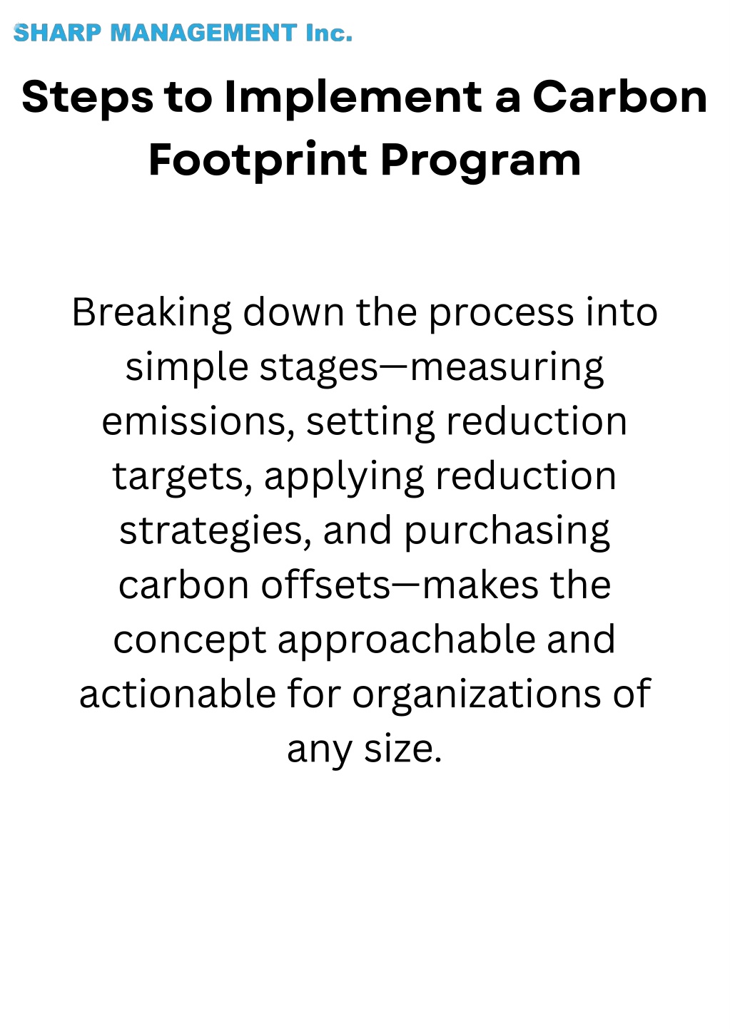 Steps to Implement a Carbon Footprint Program Breaking down the process into simple stages—measuring emissions, setting reduction targets, applying reduction strategies, and purchasing carbon offsets—makes the concept approachable and actionable for organizations of any size.