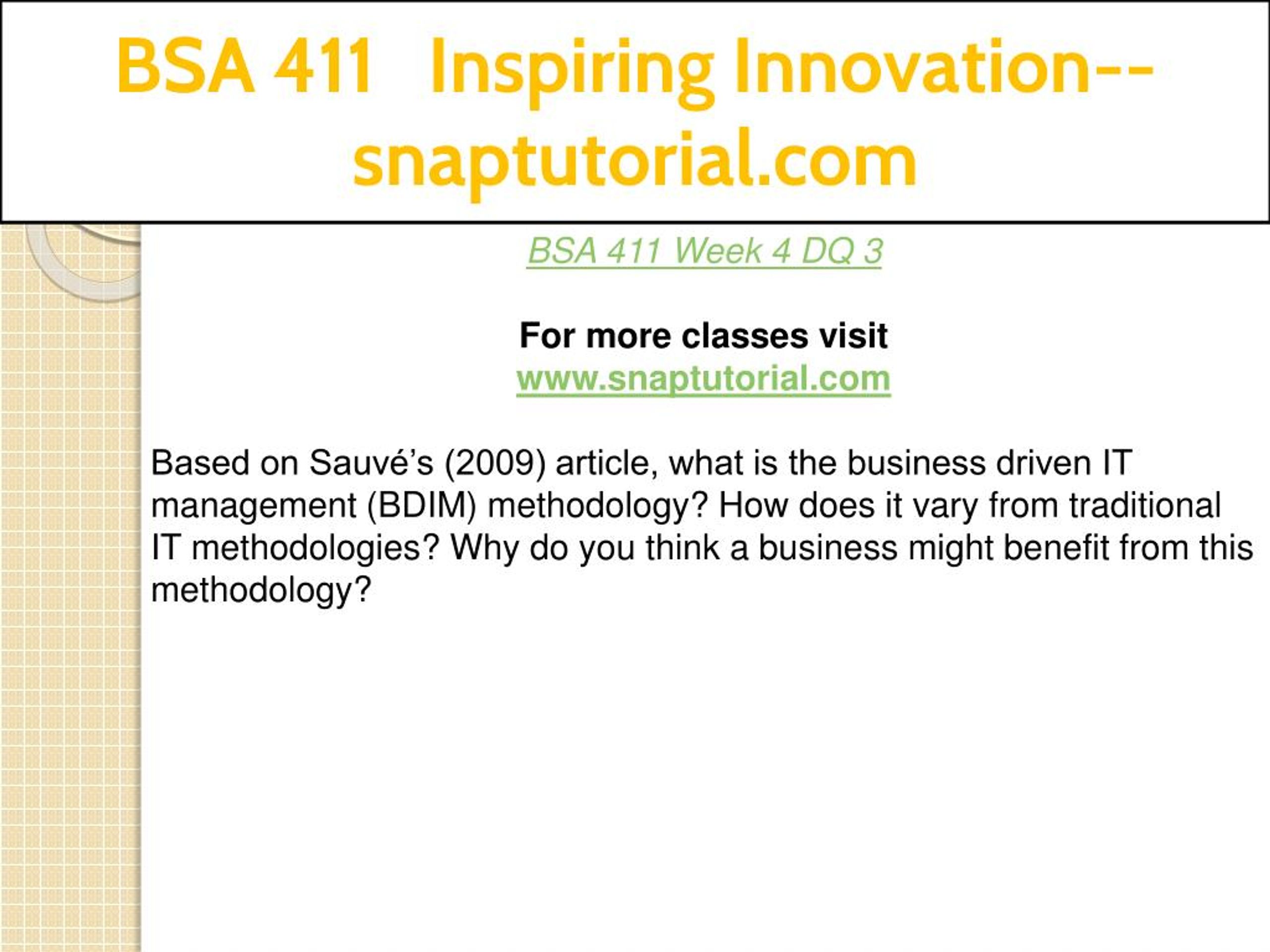 BSA 411 Inspiring Innovation--snaptutorial.com BSA 411 Week 4 DQ 3 For more classes visit www.snaptutorial.com Based on Sauvé’s (2009) article, what is the business driven IT management (BDIM) methodology? How does it vary from traditional IT methodologies? Why do you think a business might benefit from this methodology?