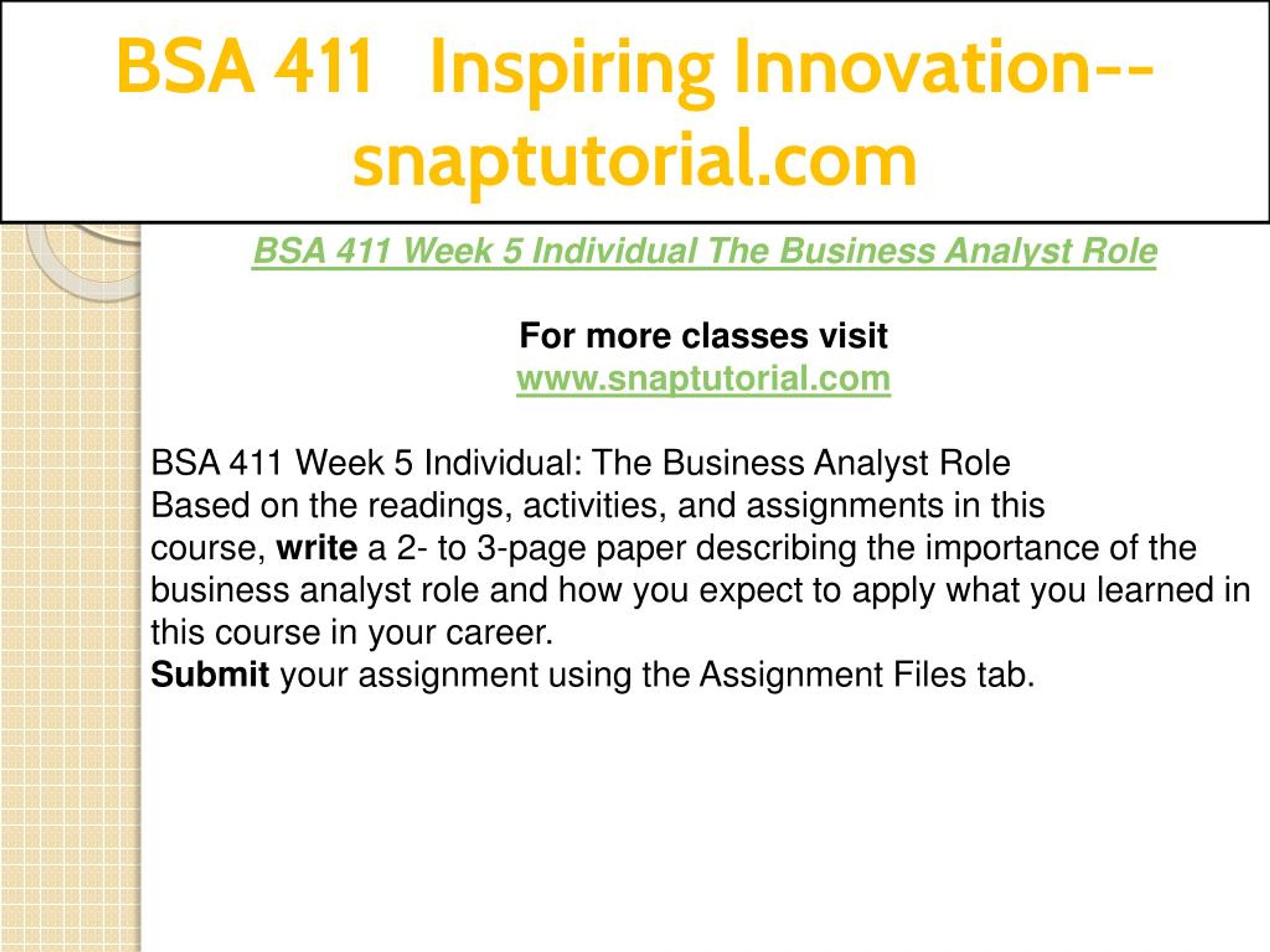 BSA 411 Inspiring Innovation--snaptutorial.com BSA 411 Week 5 Individual The Business Analyst Role For more classes visit www.snaptutorial.com BSA 411 Week 5 Individual: The Business Analyst Role Based on the readings, activities, and assignments in this course, write a 2- to 3-page paper describing the importance of the business analyst role and how you expect to apply what you learned in this course in your career. Submit your assignment using the Assignment Files tab.