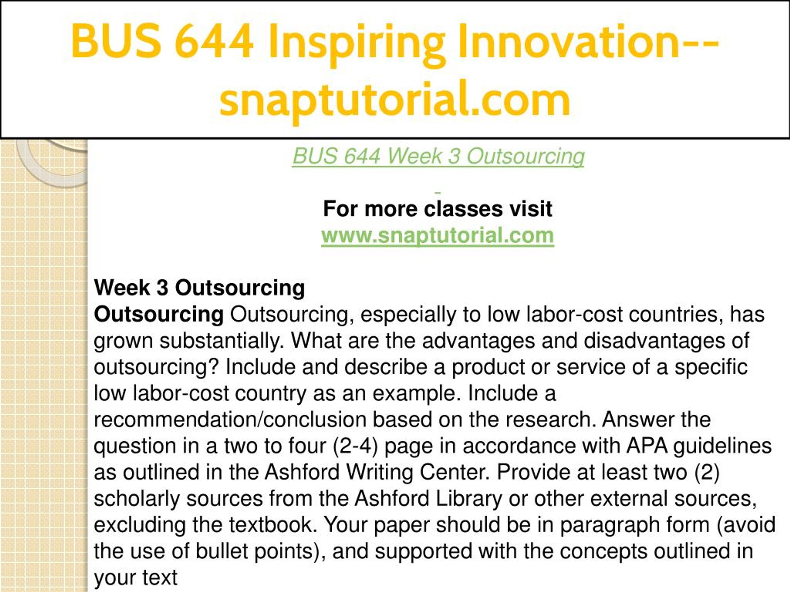 BUS 644 Inspiring Innovation--snaptutorial.com BUS 644 Week 3 Outsourcing For more classes visit www.snaptutorial.com Week 3 Outsourcing Outsourcing Outsourcing, especially to low labor-cost countries, has grown substantially. What are the advantages and disadvantages of outsourcing? Include and describe a product or service of a specific low labor-cost country as an example. Include a recommendation/conclusion based on the research. Answer the question in a two to four (2-4) page in accordance with APA guidelines as outlined in the Ashford Writing Center. Provide at least two (2) scholarly sources from the Ashford Library or other external sources, excluding the textbook. Your paper should be in paragraph form (avoid the use of bullet points), and supported with the concepts outlined in your text
