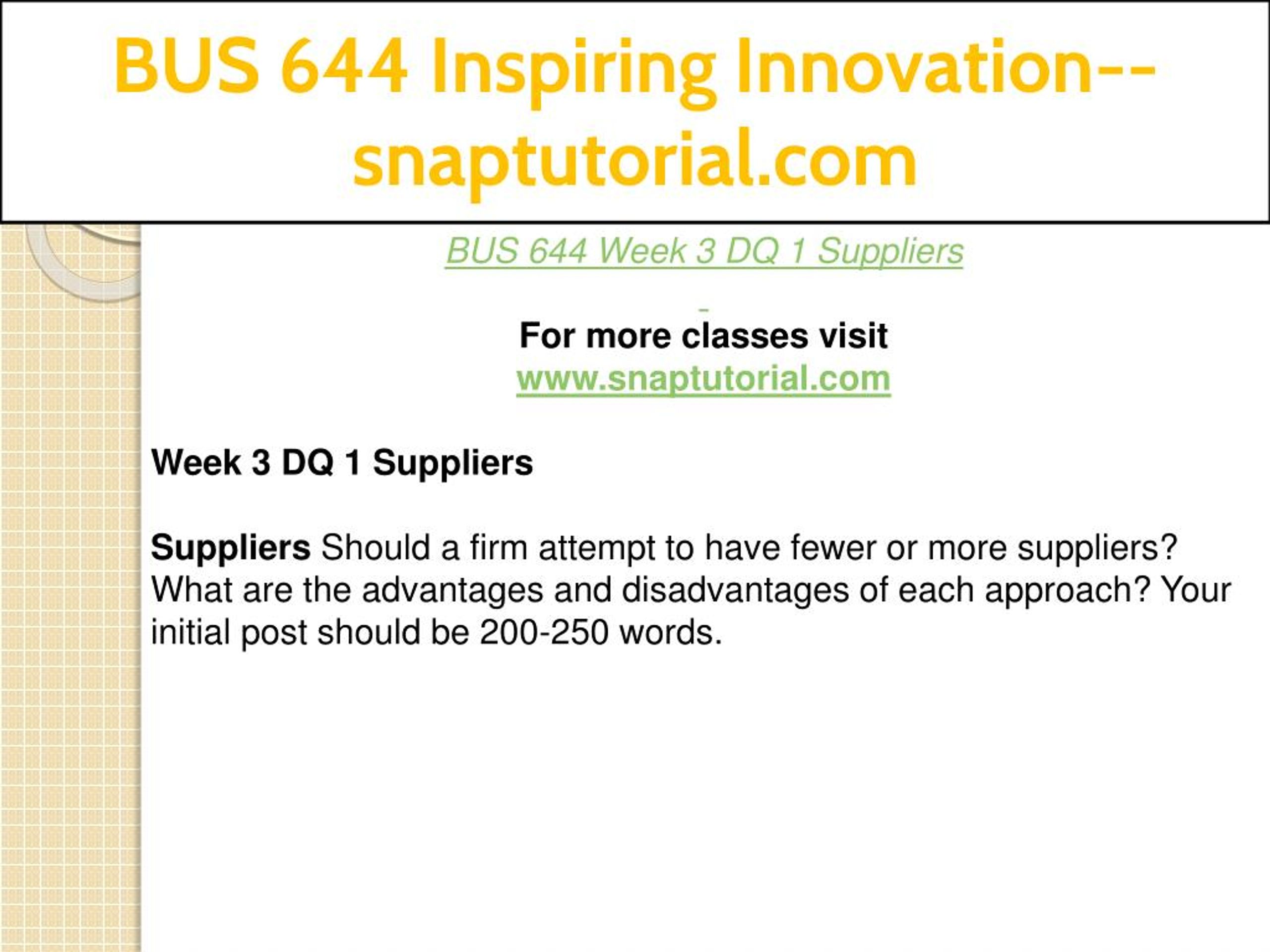 BUS 644 Inspiring Innovation--snaptutorial.com BUS 644 Week 3 DQ 1 Suppliers For more classes visit www.snaptutorial.com Week 3 DQ 1 Suppliers Suppliers Should a firm attempt to have fewer or more suppliers? What are the advantages and disadvantages of each approach? Your initial post should be 200-250 words.
