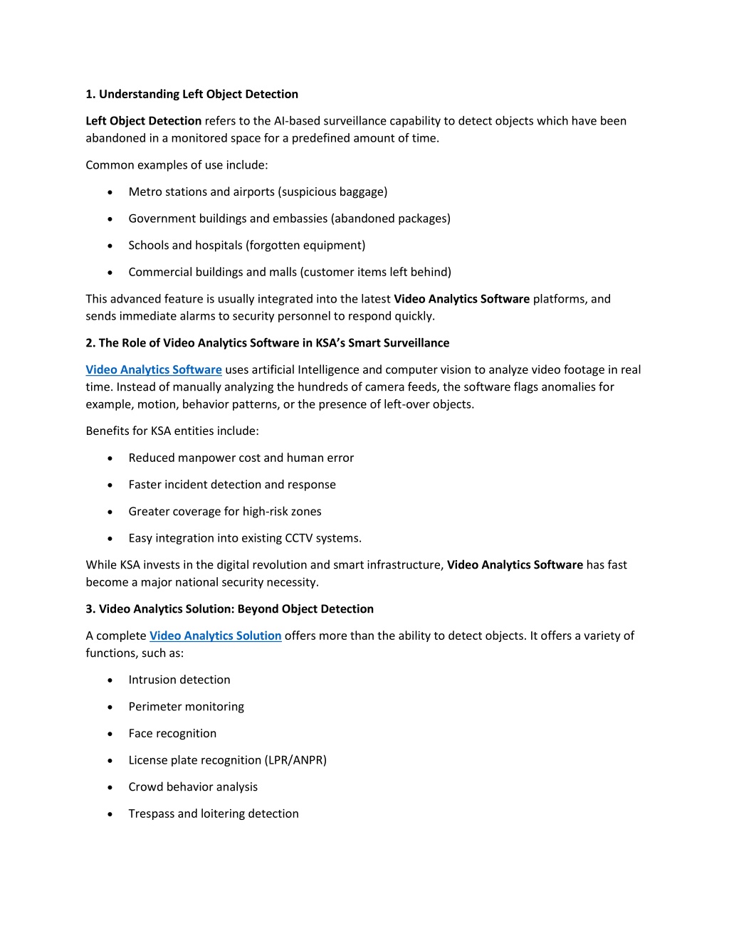 Integration of Left Object Detection along with these features allows KSA authorities and facility operators with a powerful, integrated central command and security management. 4. Deployment across KSA: Where It Matters Most The use of Video Analytics Services in KSA is the most significant in: • KSA International Airport - for real-time baggage monitoring • Public transportation hubs - to prevent terror threats or service disruptions • Shopping malls and retail chains - to ensure customer safety • Hotels and event venues - for VIP security and crowd management • Educational institutions - to safeguard students and faculty Every one of these settings benefits through proactive monitoring powered by intelligent Video Analytics Software. 5. How Left Object Detection Works in Real-Time The way the process usually takes place: 1.Detection Phase: A stationary object appears in the scene and remains unclaimed for a preset time threshold. 2.Analysis Phase: The Video Analytics Solution compares object movement patterns and cross- references with human presence. 3.Alert Phase: If deemed suspicious or unattended, the system sends a real-time notification to the command center or security staff. 4.Response Phase: Authorities can then dispatch personnel to assess the item or initiate safety protocols. Machine learning is the reason why the system gets better with time, decreasing false alarms while increasing the precision. 6. Integration with Emergency Response Systems Video Analytics Services aren't standalone, they're best when paired with • Access Control Systems • Fire and evacuation alarms • Law enforcement communication tools • Centralized security dashboards This integration is able to ensure an efficient response. It allows security teams operating in KSA to react quickly in full-time awareness of any situation. 7. Privacy and Compliance in Video Surveillance