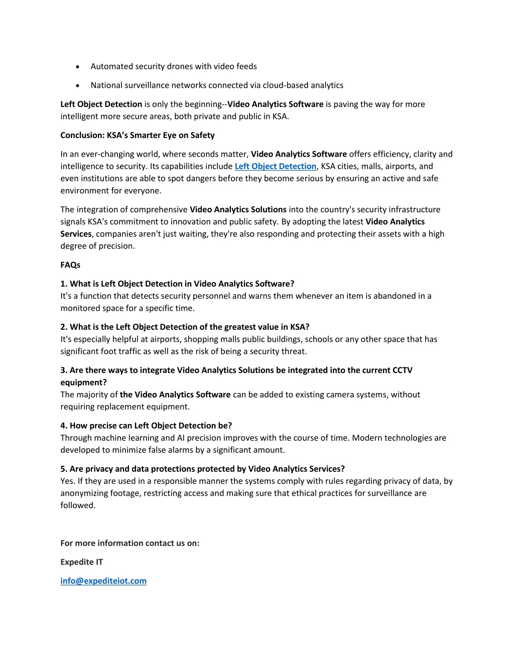 • Automated security drones with video feeds • National surveillance networks connected via cloud-based analytics Left Object Detection is only the beginning--Video Analytics Software is paving the way for more intelligent more secure areas, both private and public in KSA. Conclusion: KSA’s Smarter Eye on Safety In an ever-changing world, where seconds matter, Video Analytics Software offers efficiency, clarity and intelligence to security. Its capabilities include Left Object Detection, KSA cities, malls, airports, and even institutions are able to spot dangers before they become serious by ensuring an active and safe environment for everyone. The integration of comprehensive Video Analytics Solutions into the country's security infrastructure signals KSA's commitment to innovation and public safety. By adopting the latest Video Analytics Services, companies aren't just waiting, they're also responding and protecting their assets with a high degree of precision. FAQs 1. What is Left Object Detection in Video Analytics Software? It's a function that detects security personnel and warns them whenever an item is abandoned in a monitored space for a specific time. 2. What is the Left Object Detection of the greatest value in KSA? It's especially helpful at airports, shopping malls public buildings, schools or any other space that has significant foot traffic as well as the risk of being a security threat. 3. Are there ways to integrate Video Analytics Solutions be integrated into the current CCTV equipment? The majority of the Video Analytics Software can be added to existing camera systems, without requiring replacement equipment. 4. How precise can Left Object Detection be? Through machine learning and AI precision improves with the course of time. Modern technologies are developed to minimize false alarms by a significant amount. 5. Are privacy and data protections protected by Video Analytics Services? Yes. If they are used in a responsible manner the systems comply with rules regarding privacy of data, by anonymizing footage, restricting access and making sure that ethical practices for surveillance are followed. For more information contact us on: Expedite IT info@expediteiot.com