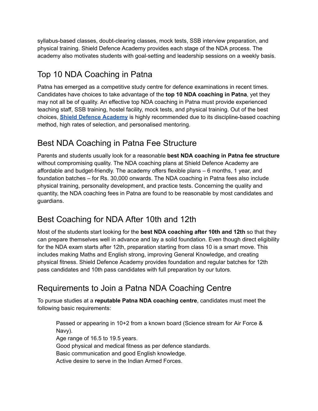 syllabus-based classes, doubt-clearing classes, mock tests, SSB interview preparation, and physical training. Shield Defence Academy provides each stage of the NDA process. The academy also motivates students with goal-setting and leadership sessions on a weekly basis. Top 10 NDA Coaching in Patna Patna has emerged as a competitive study centre for defence examinations in recent times. Candidates have choices to take advantage of the top 10 NDA coaching in Patna, yet they may not all be of quality. An effective top NDA coaching in Patna must provide experienced teaching staff, SSB training, hostel facility, mock tests, and physical training. Out of the best choices, Shield Defence Academy is highly recommended due to its discipline-based coaching method, high rates of selection, and personalised mentoring. Best NDA Coaching in Patna Fee Structure Parents and students usually look for a reasonable best NDA coaching in Patna fee structure without compromising quality. The NDA coaching plans at Shield Defence Academy are affordable and budget-friendly. The academy offers flexible plans – 6 months, 1 year, and foundation batches – for Rs. 30,000 onwards. The NDA coaching in Patna fees also include physical training, personality development, and practice tests. Concerning the quality and quantity, the NDA coaching fees in Patna are found to be reasonable by most candidates and guardians. Best Coaching for NDA After 10th and 12th Most of the students start looking for the best NDA coaching after 10th and 12th so that they can prepare themselves well in advance and lay a solid foundation. Even though direct eligibility for the NDA exam starts after 12th, preparation starting from class 10 is a smart move. This includes making Maths and English strong, improving General Knowledge, and creating physical fitness. Shield Defence Academy provides foundation and regular batches for 12th pass candidates and 10th pass candidates with full preparation by our tutors. Requirements to Join a Patna NDA Coaching Centre To pursue studies at a reputable Patna NDA coaching centre, candidates must meet the following basic requirements: Passed or appearing in 10+2 from a known board (Science stream for Air Force & Navy). Age range of 16.5 to 19.5 years. Good physical and medical fitness as per defence standards. Basic communication and good English knowledge. Active desire to serve in the Indian Armed Forces.