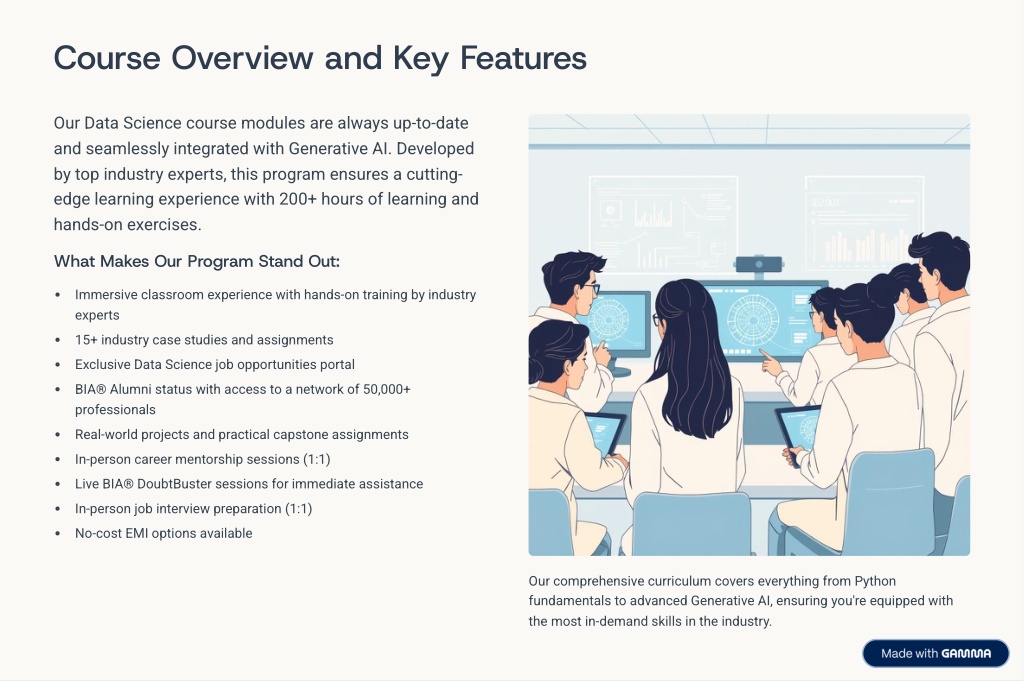 Course Overview and Key Features Our Data Science course modules are always up-to-date and seamlessly integrated with Generative AI. Developed by top industry experts, this program ensures a cutting- edge learning experience with 200+ hours of learning and hands-on exercises. What Makes Our Program Stand Out: Immersive classroom experience with hands-on training by industry experts 15+ industry case studies and assignments Exclusive Data Science job opportunities portal BIA® Alumni status with access to a network of 50,000+ professionals Real-world projects and practical capstone assignments In-person career mentorship sessions (1:1) Live BIA® DoubtBuster sessions for immediate assistance In-person job interview preparation (1:1) No-cost EMI options available Our comprehensive curriculum covers everything from Python fundamentals to advanced Generative AI, ensuring you're equipped with the most in-demand skills in the industry.