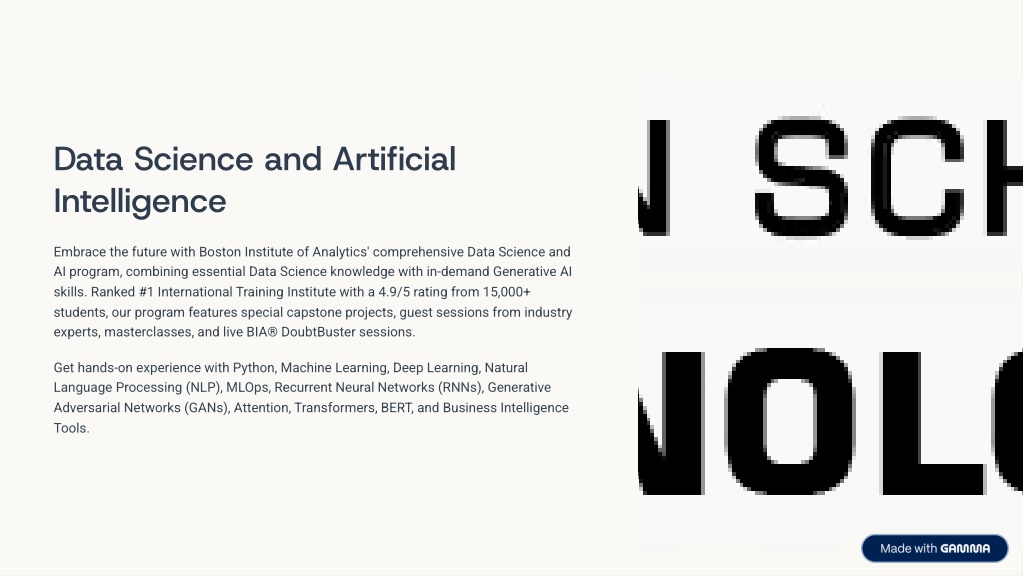 Data Science and Artificial Intelligence Embrace the future with Boston Institute of Analytics' comprehensive Data Science and AI program, combining essential Data Science knowledge with in-demand Generative AI skills. Ranked #1 International Training Institute with a 4.9/5 rating from 15,000+ students, our program features special capstone projects, guest sessions from industry experts, masterclasses, and live BIA® DoubtBuster sessions. Get hands-on experience with Python, Machine Learning, Deep Learning, Natural Language Processing (NLP), MLOps, Recurrent Neural Networks (RNNs), Generative Adversarial Networks (GANs), Attention, Transformers, BERT, and Business Intelligence Tools.