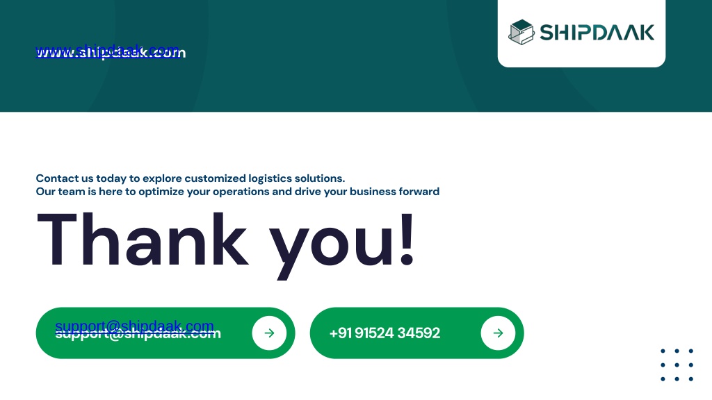 www.shipdaak.com Contact us today to explore customized logistics solutions. Our team is here to optimize your operations and drive your business forward Thank you! +91 91524 34592 support@shipdaak.com